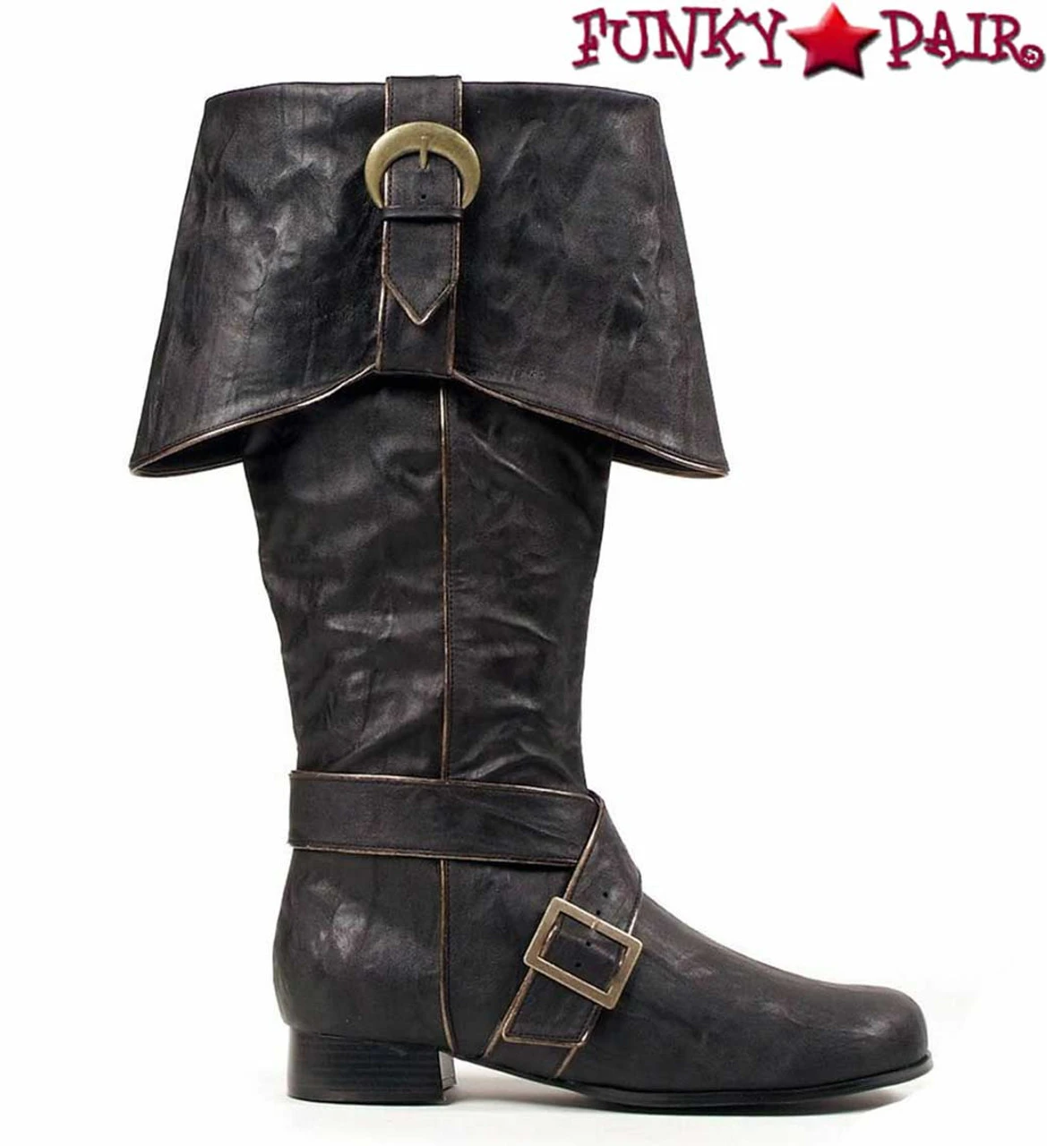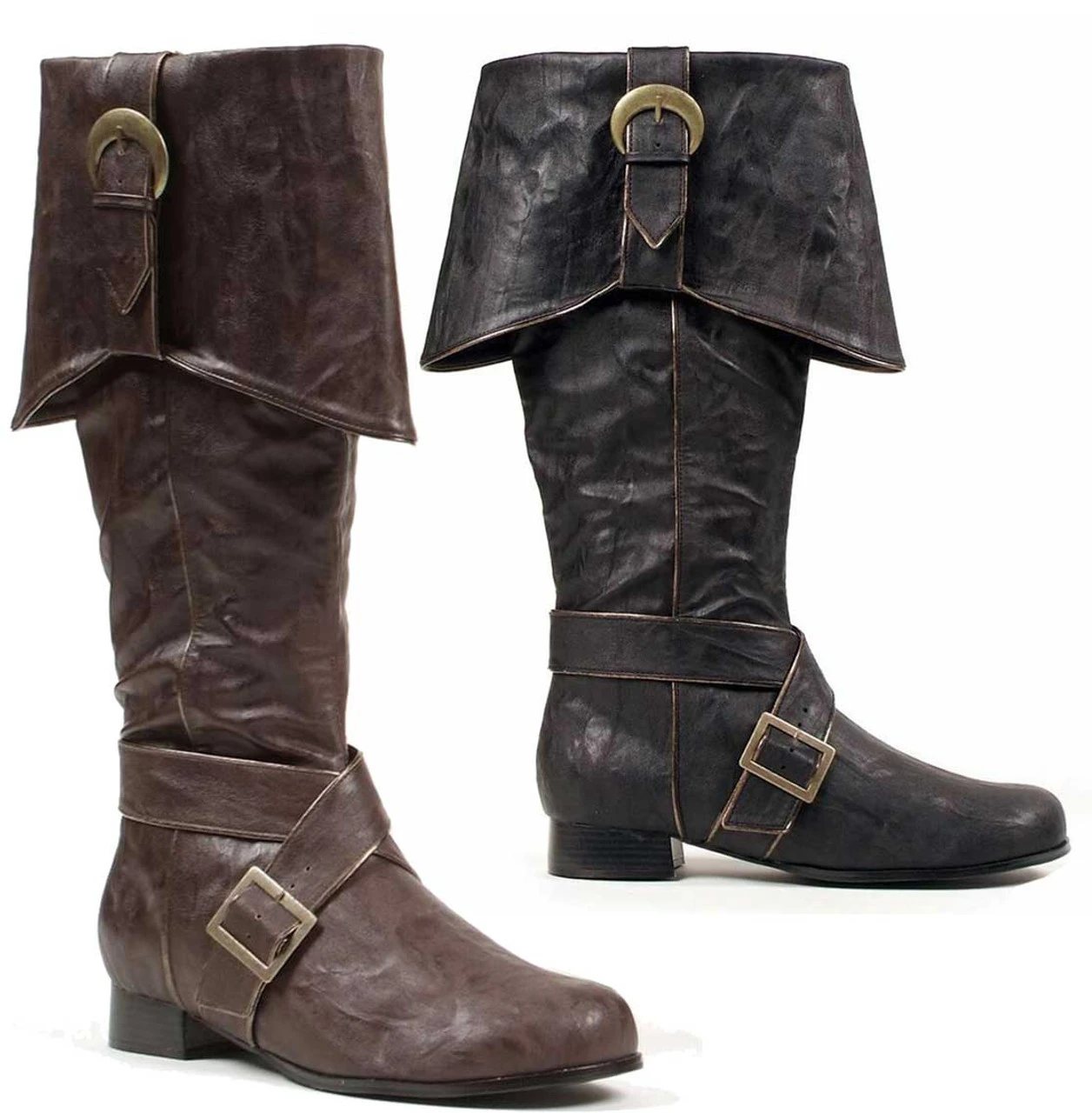 Approximately 1 inch men pirate boots with bell fold and buckles featuring a full length inner zipper.