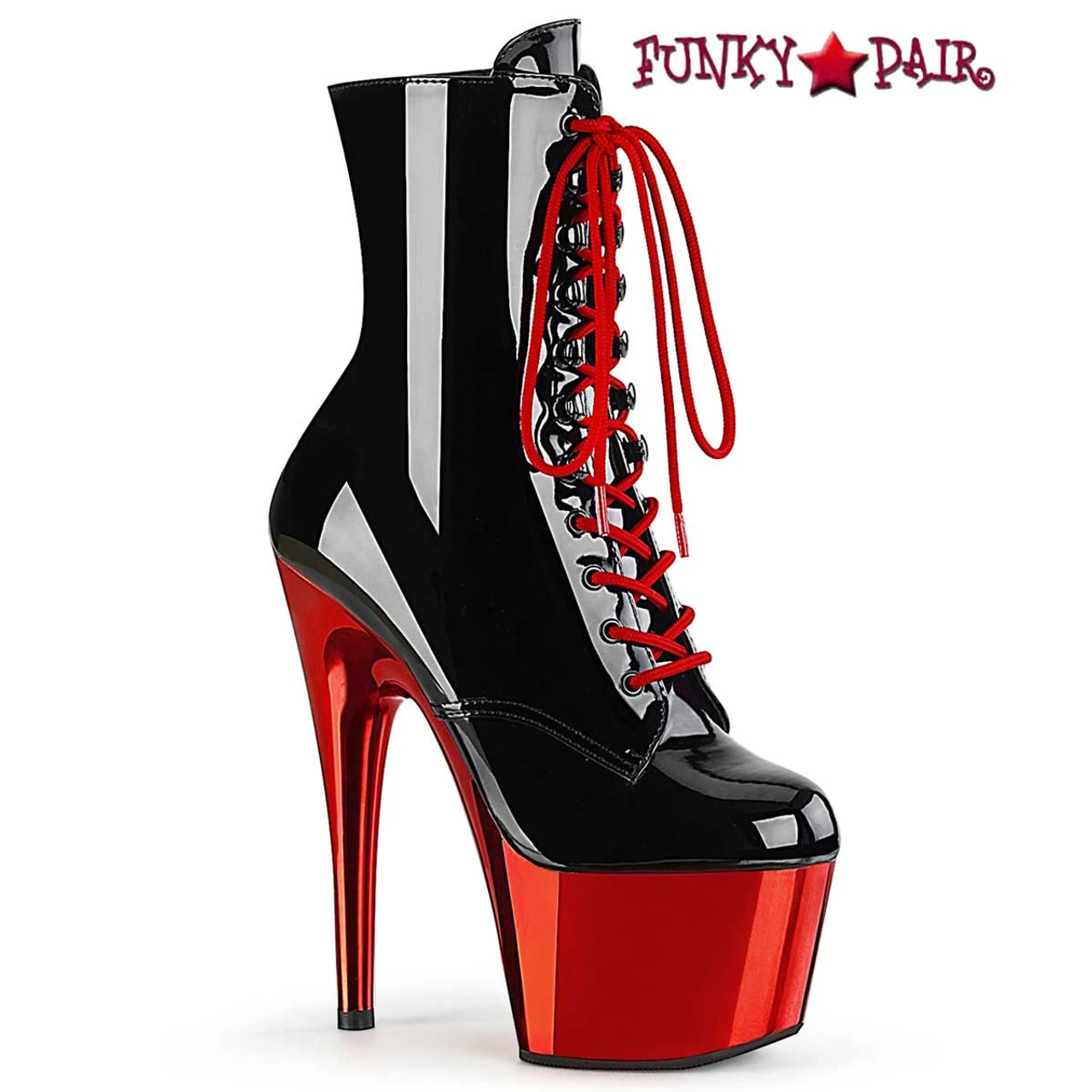 7″ (178mm) Heel, 2 3/4″ (70mm) Platform Two Tone Lace-up Front Ankle Boot Featuring Chrome Plated Platform Bottom, Inner Side Zip Closure