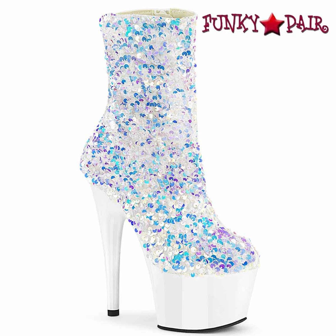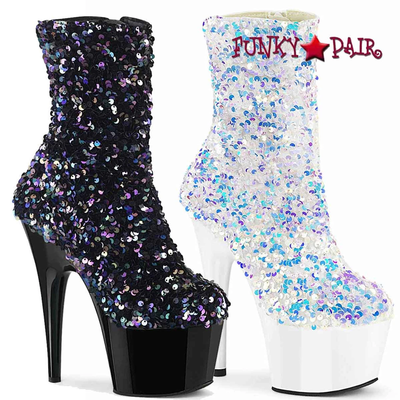 Approximately 7″ (178mm) Heel, 2 3/4″ (70mm) Platform Sequins Ankle Boot, Inner Side Zip Closure