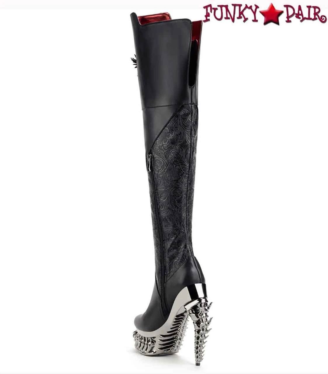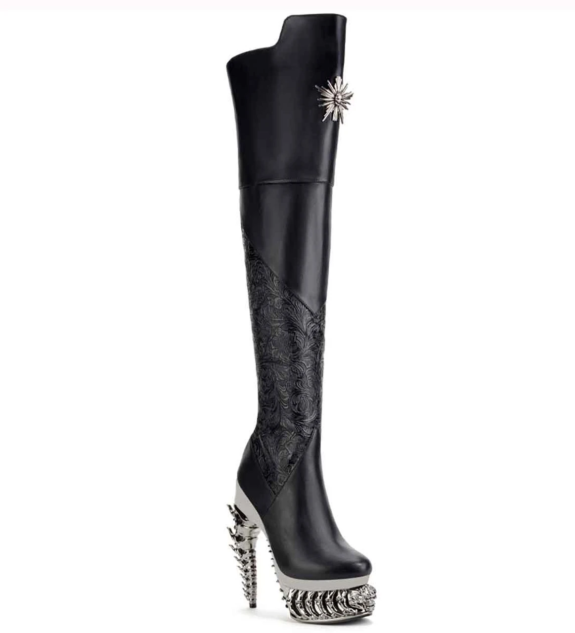 5″ signature curved heel with hidden stiletto, Wide platform construction for added comfort, Layered Victorian pattern design Over the Knee Boots