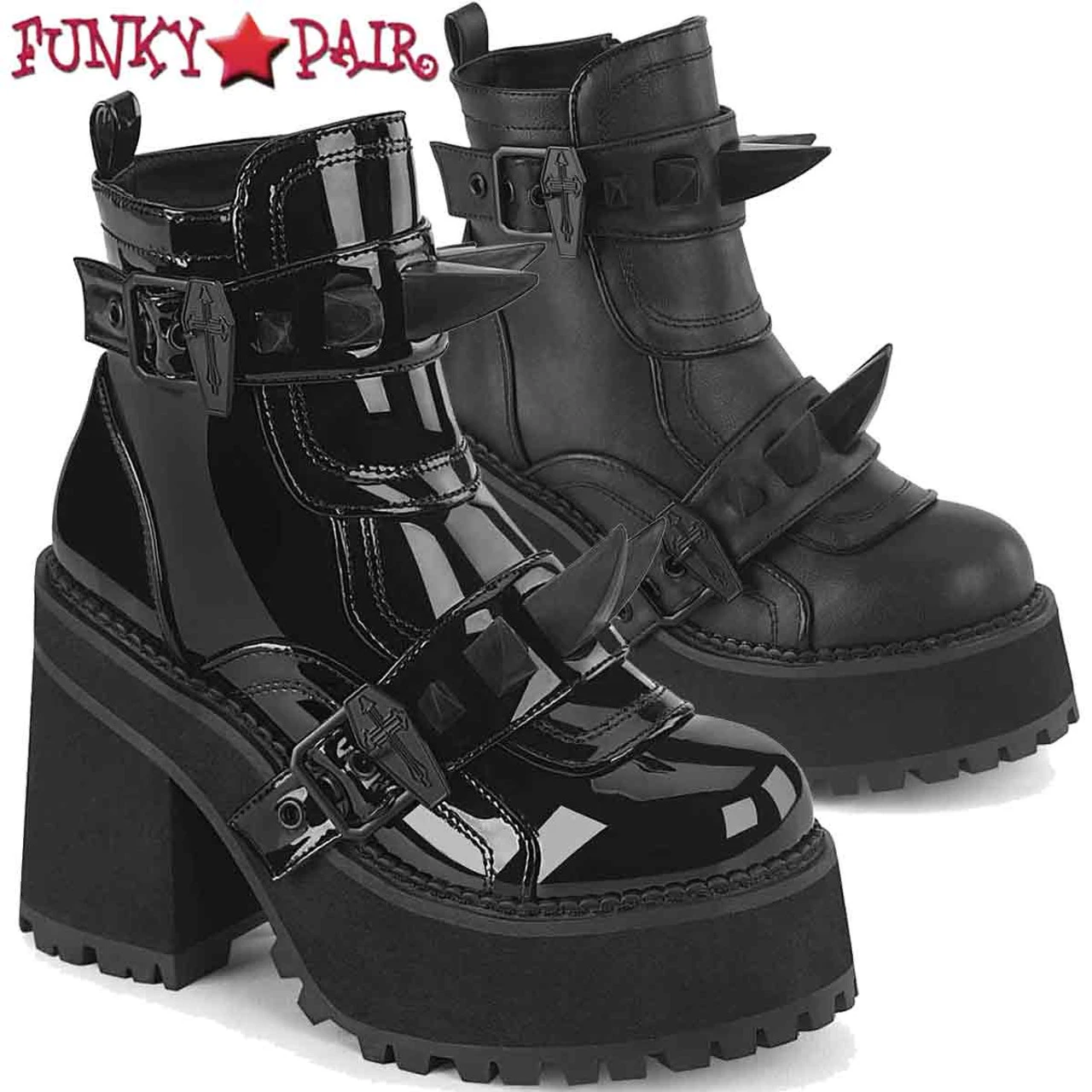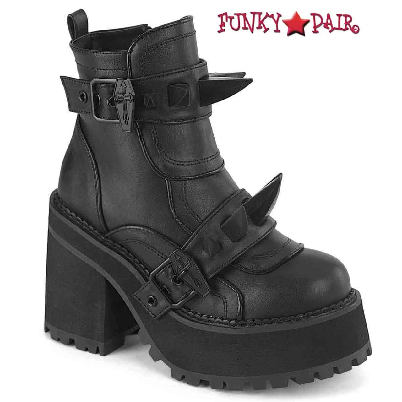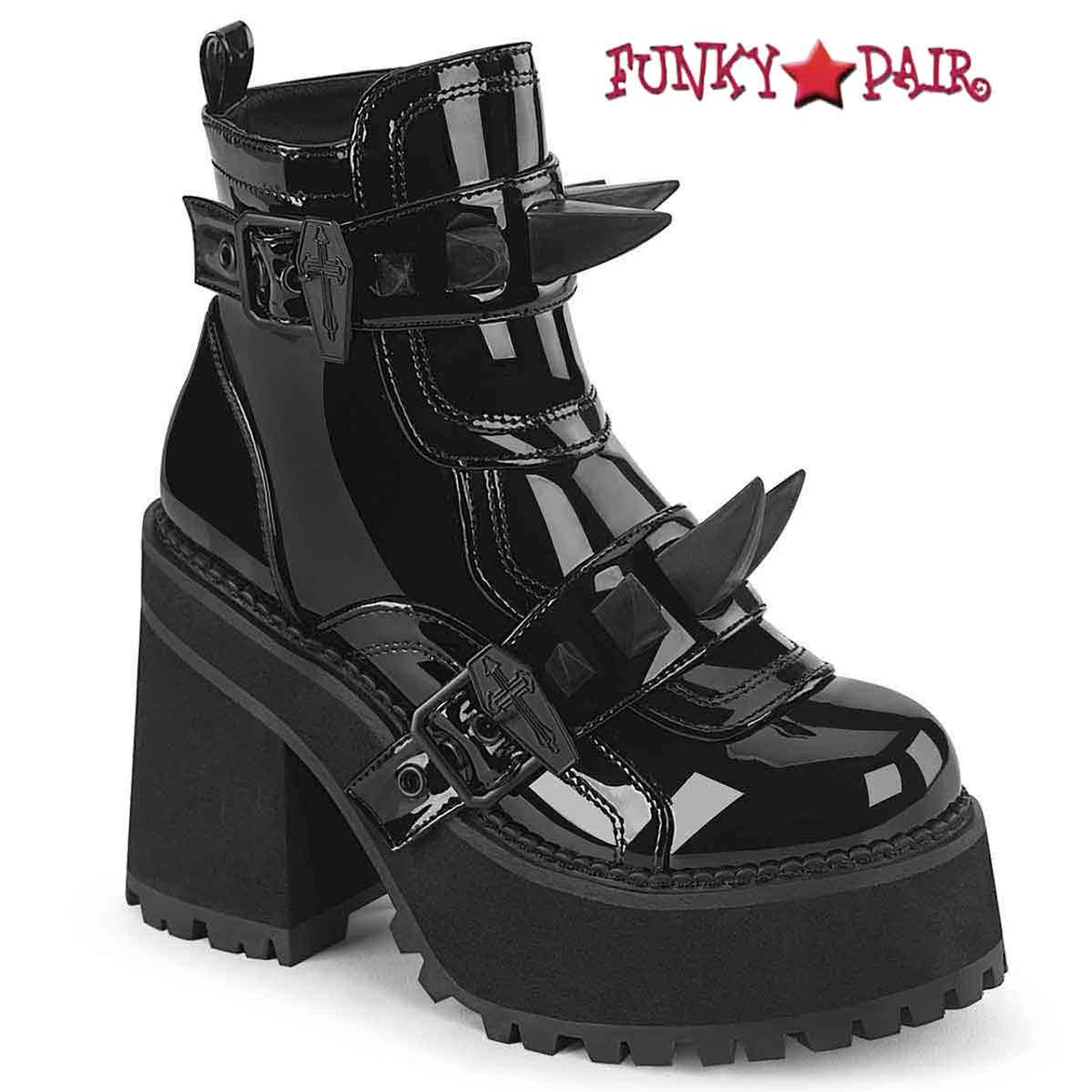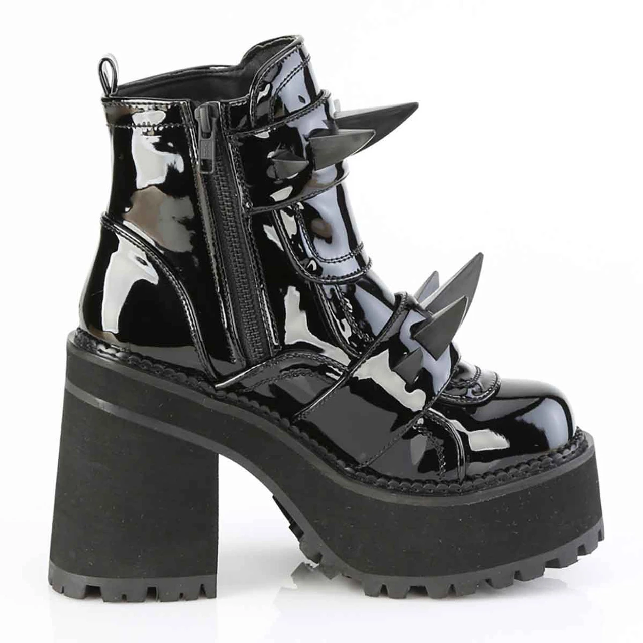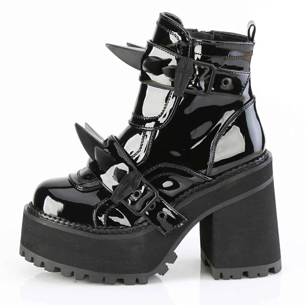 4 3/4″ (121mm) Block Heel, 2 1/4″ (57mm) Cleated Platform Ankle Boot Feauring Rubber Claw Spike Studded Front Shield w/ Coffin Buckle Straps, Inside Metal Zip Closure