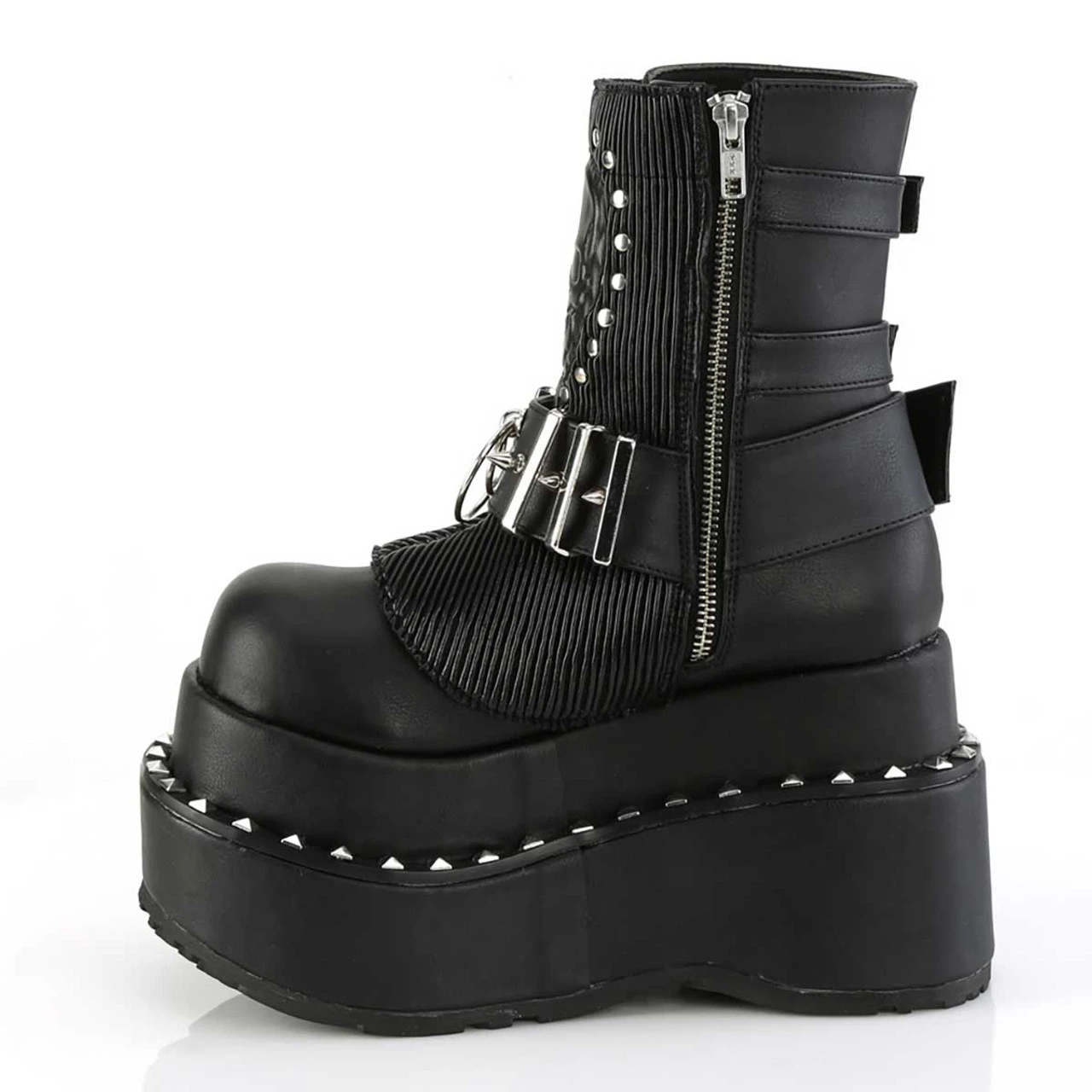 4 1/2″ (114mm) Tiered Pyramid Stud Trimmed Platform Lace-Up Ankle Boot Featuring Adjustable Quilted Shield w/ Stud & Skull Patch Details & Spike Stud, Metal Bar & O-ring Center Strap, Side Zip Closure