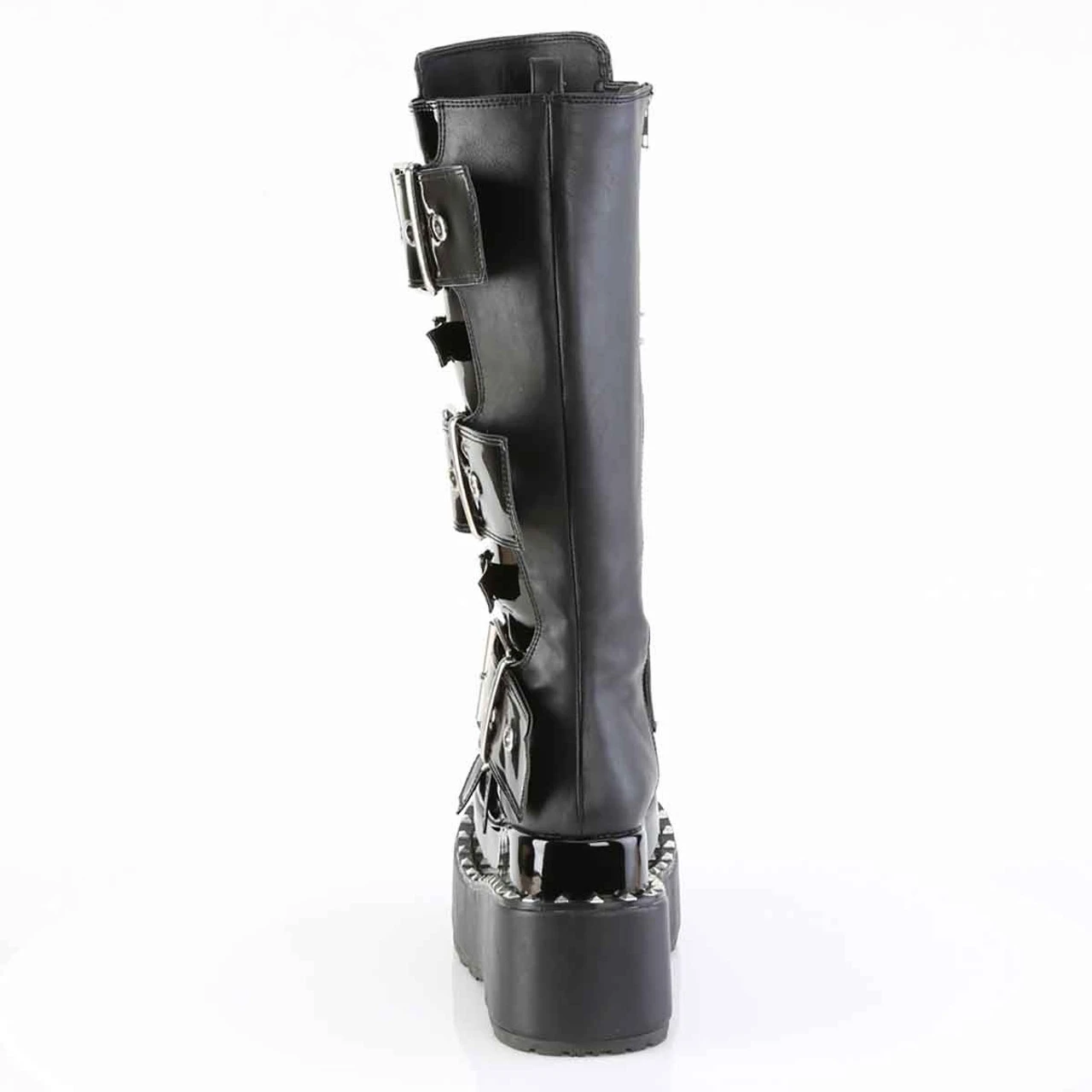 4 1/2″ (114mm) Tiered Pyramid Stud Trimmed Platform Knee High Boot Featuring Metal Claw Spiked Multi-Size Buckle Strap Closure, Inside Metal Zip Closure