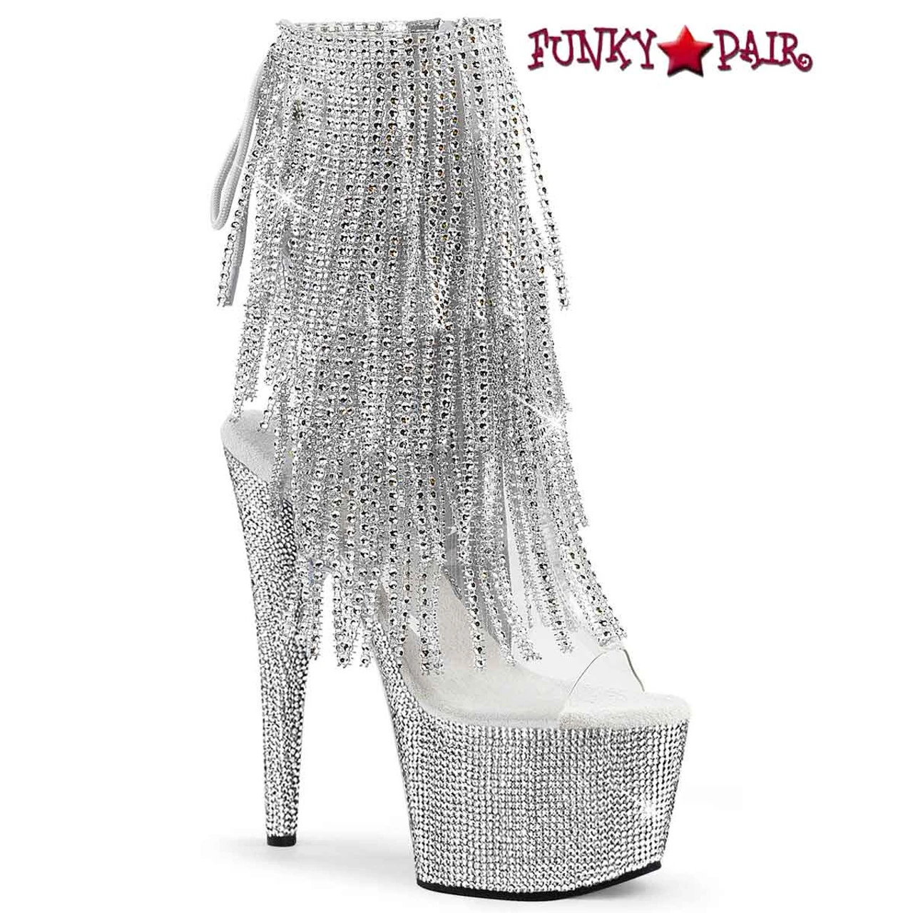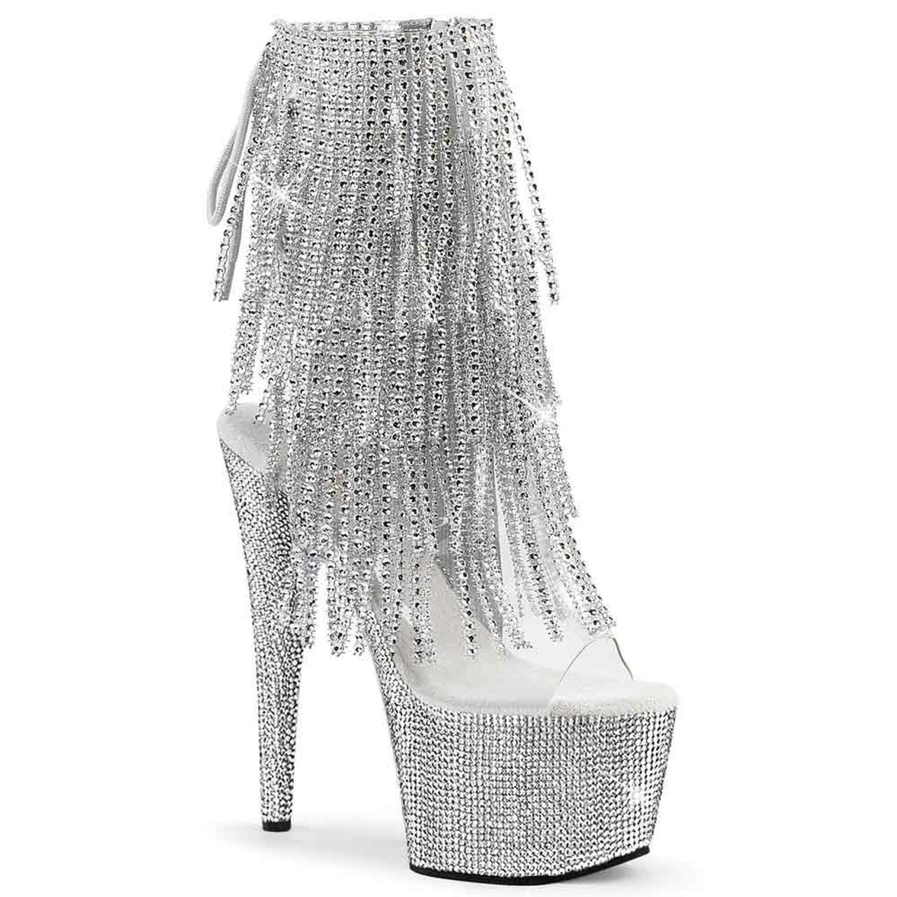 Open Toe/Heel Lace-Up Back Ankle Boot Featuring 4-LayerSimulated Rhinestone Fringe and Silver Rhinestones Encrusted All-Over the Entire Platform Bottom, Inner Side Zip Closure. Approximately 7″ (178mm) Heel, 2 3/4″ (70mm) Platform