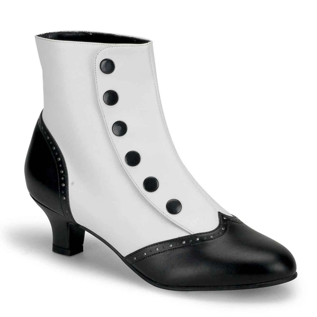 Bordello FLORA-1023 Victorian style Ankle Boots with heel button spat and contrast color. Approximately two inch heel provides comfort.