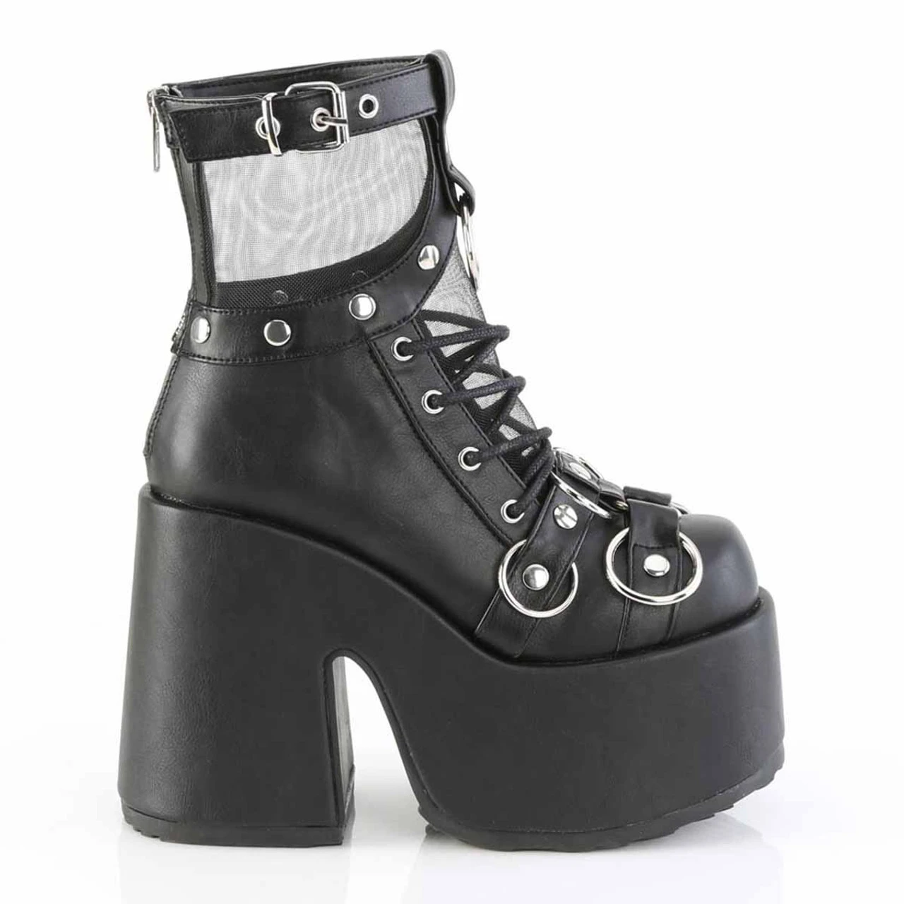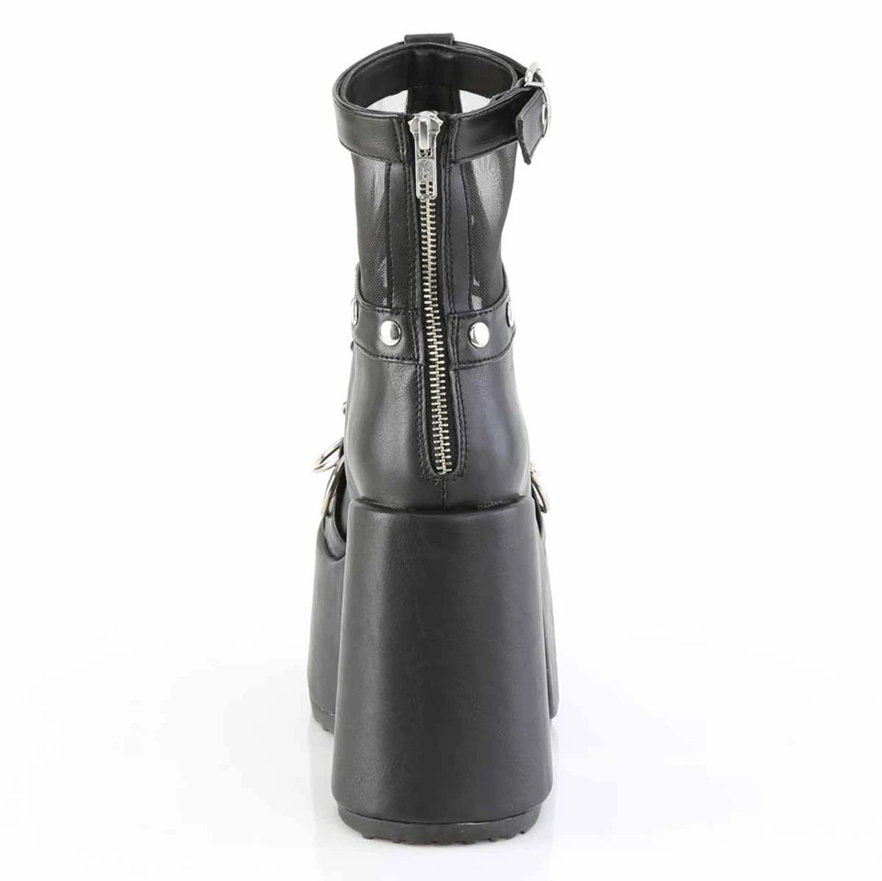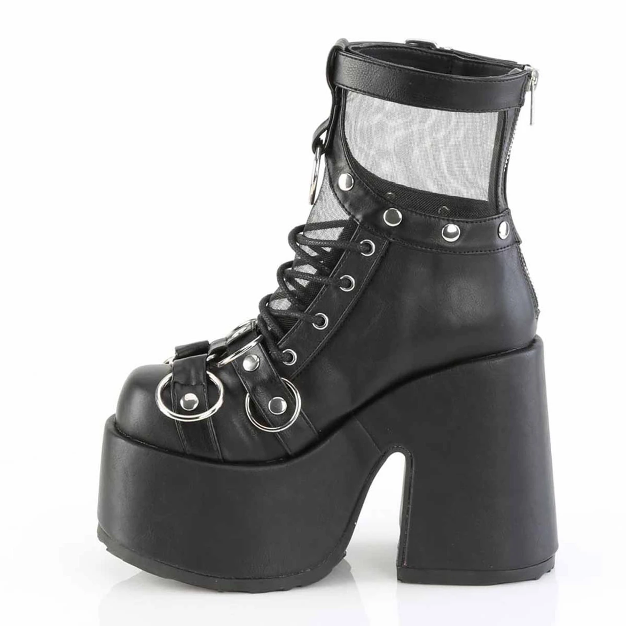 5″ (127mm) Chunky Heel, 3″ (75mm) Platform Lace-Up Front Ankle Boot Featuring Top Mesh Panel w/ Buckle Strap, O-Rings & Flat Stud Details, Back Metal Zip Closure