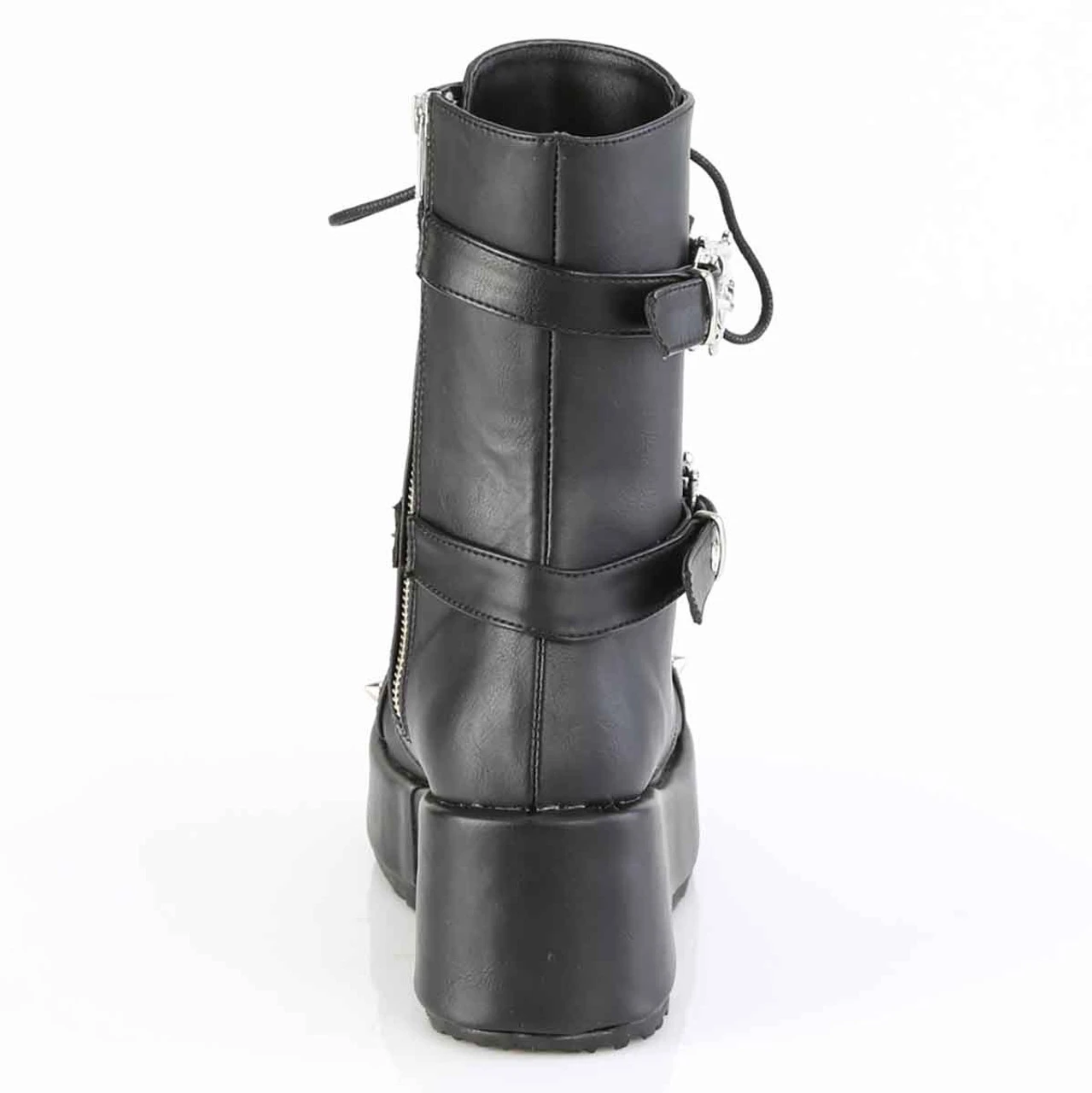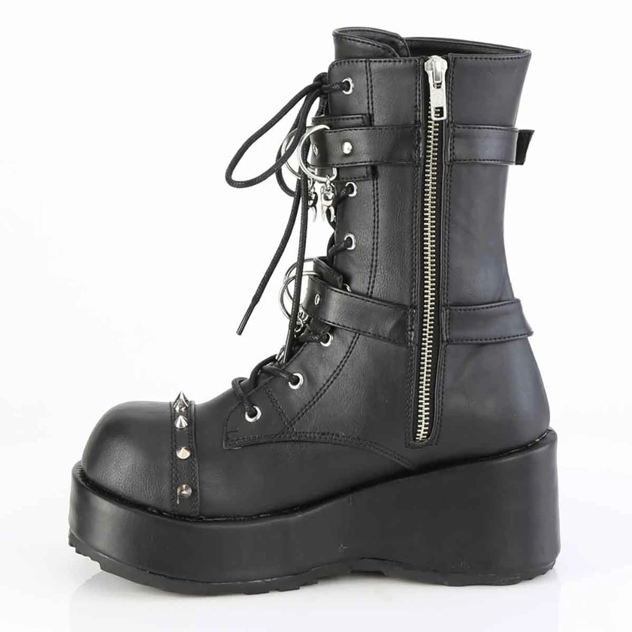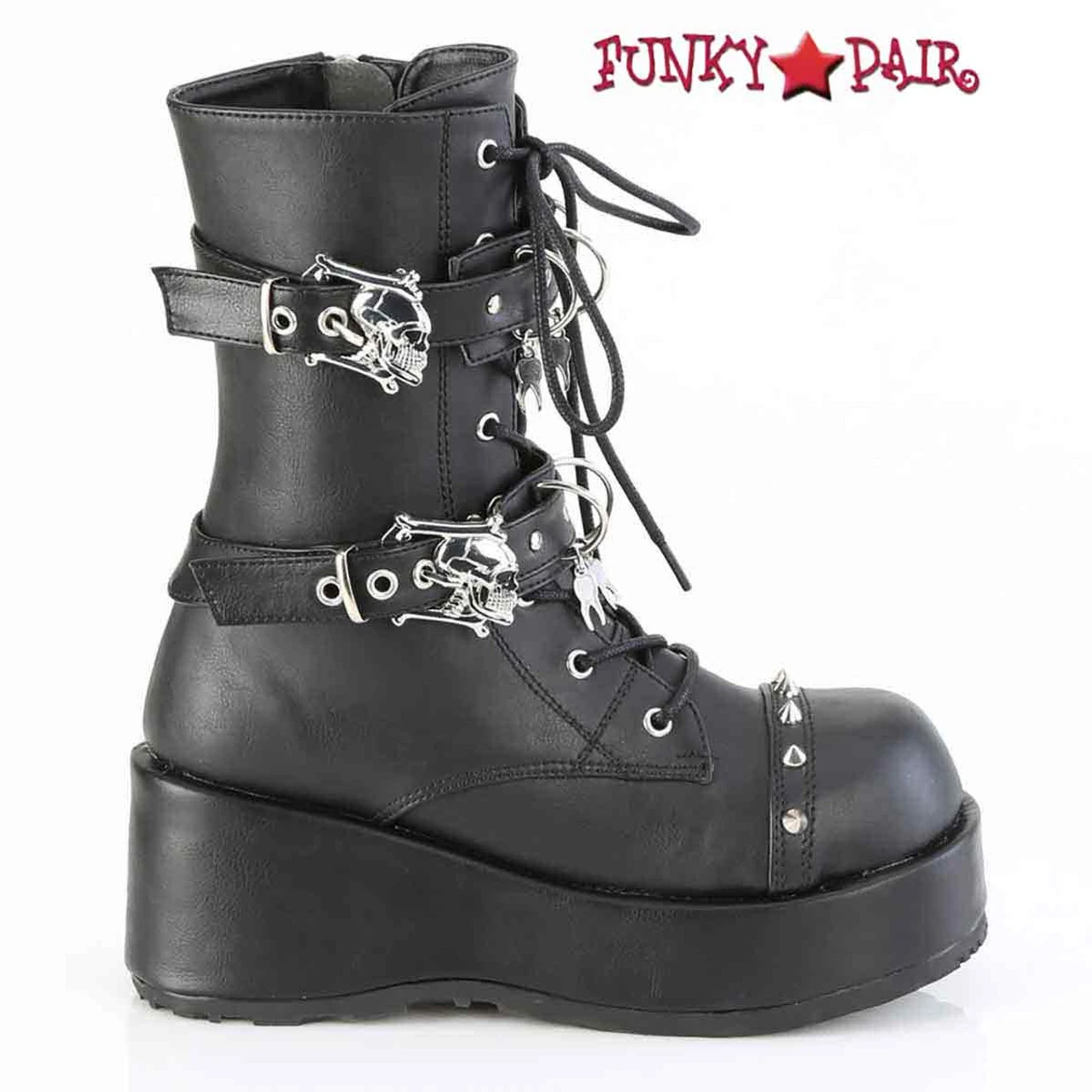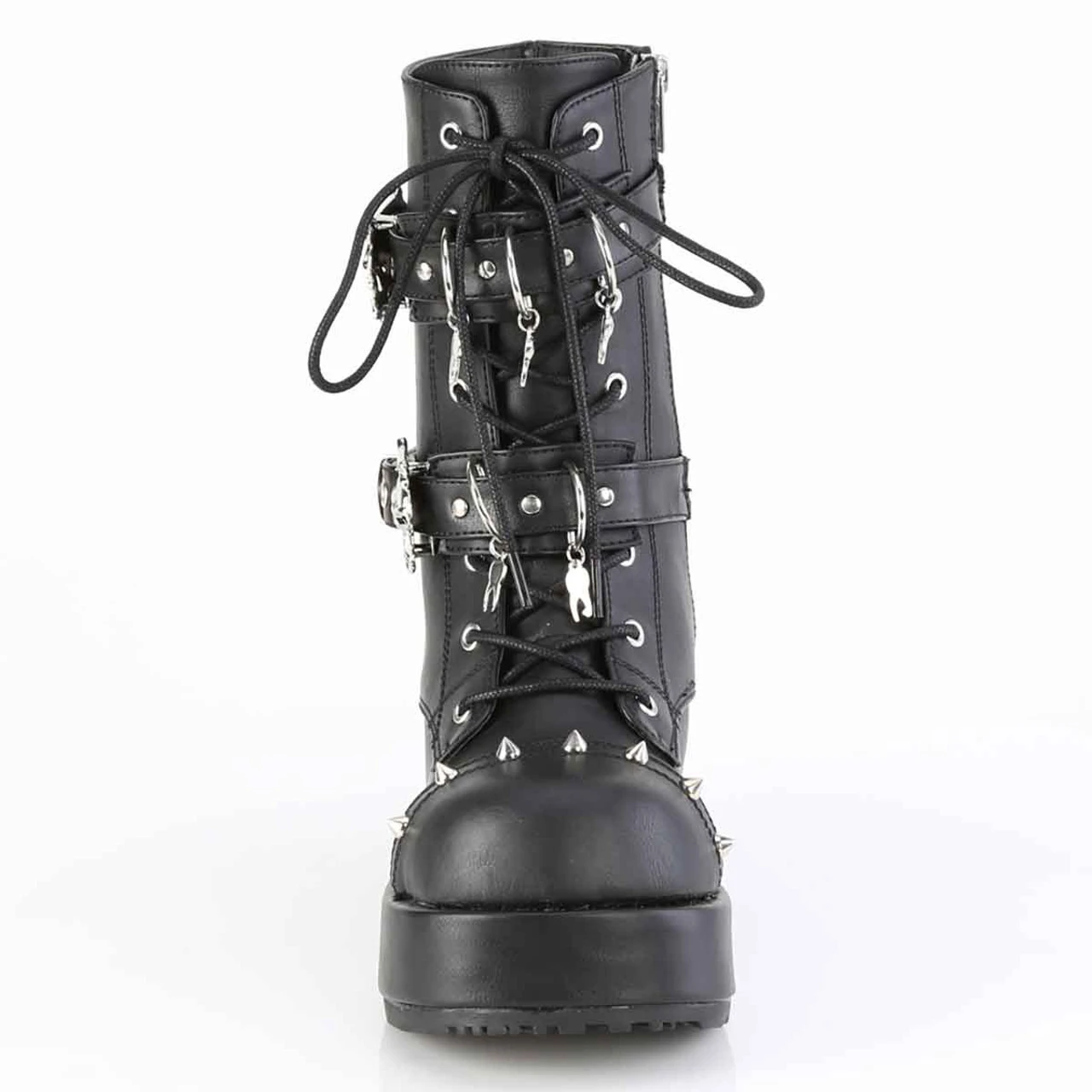 2 3/4″ (70mm) Lace-Up Front Platform Ankle Boot Featuring Double Skull Buckle Straps, D-ring & Hanging Tooth Charm on Straps, & Cone Spike Studs at the Top Cap, Inside Metal Zip Closure