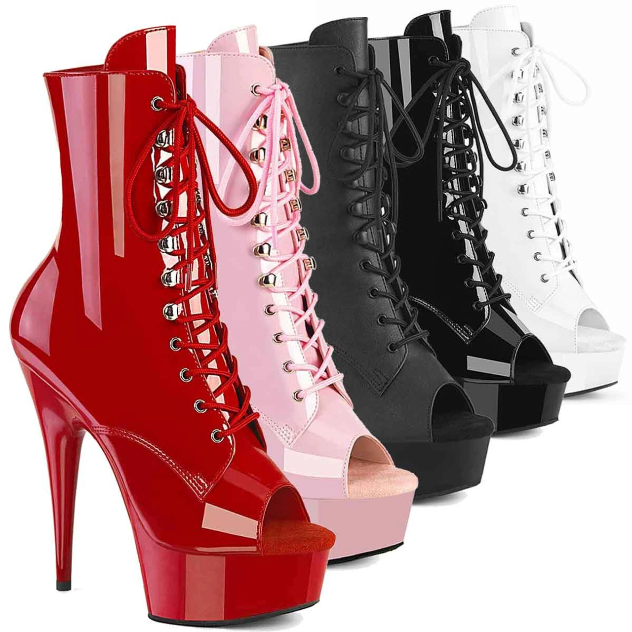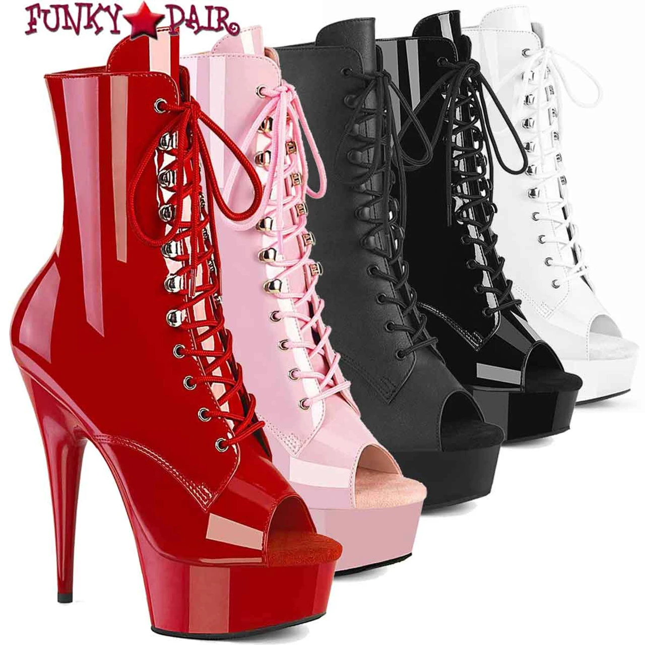 Approximately 6″ (152mm) Heel, 1 3/4″ (45mm) Plaform Peep Toe Lace-up Front Ankle Boot, Inner Side Zip Closure