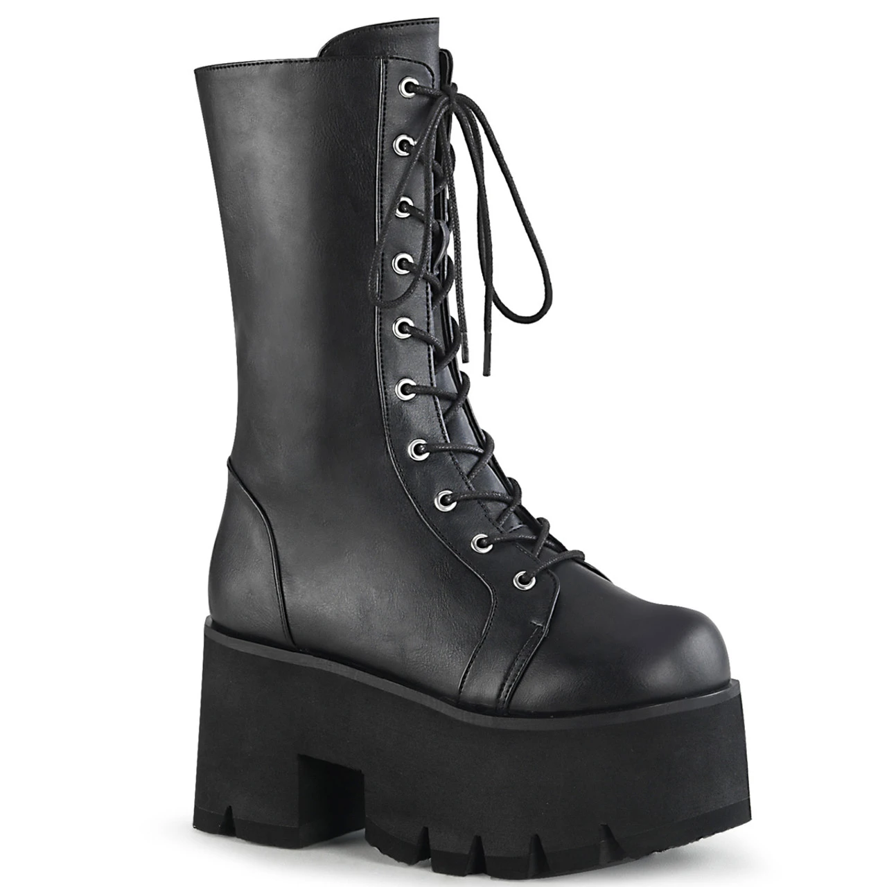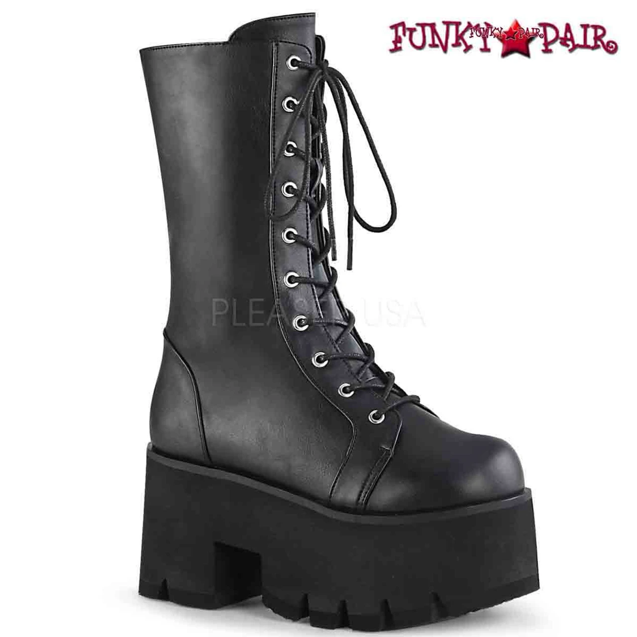 Introducing the ASHES-105: a fashionable and functional mid-calf boot featuring a chunky heel measuring 3 1/2″ (90mm) and a 2 1/4″ platform. Its side zip closure and lace-up design offer both style and support, making these boots perfect for everyday wear.