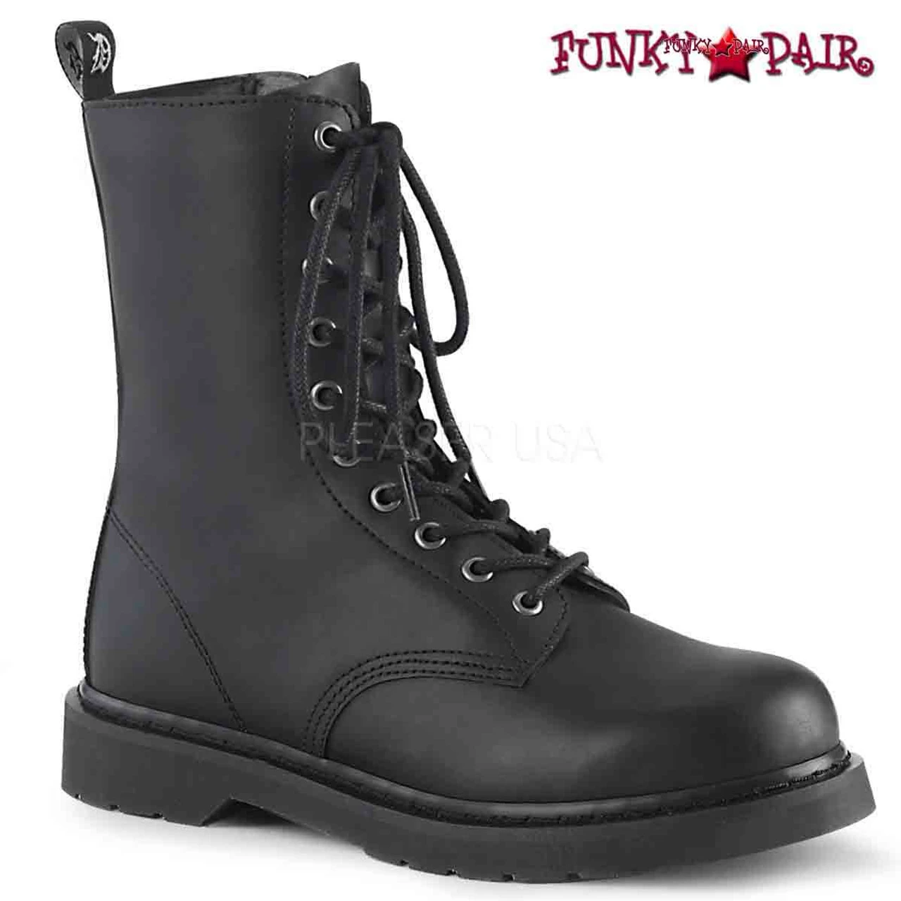 Demonia Men’s BOLT-200, Approximately 1 1/4″ (32mm) Stacked Flat Heel 10-Eyelet Lace-Up Mid Calf Unisex Vegan Boot w/ Back Pull-Tab, Inside Zip Closure