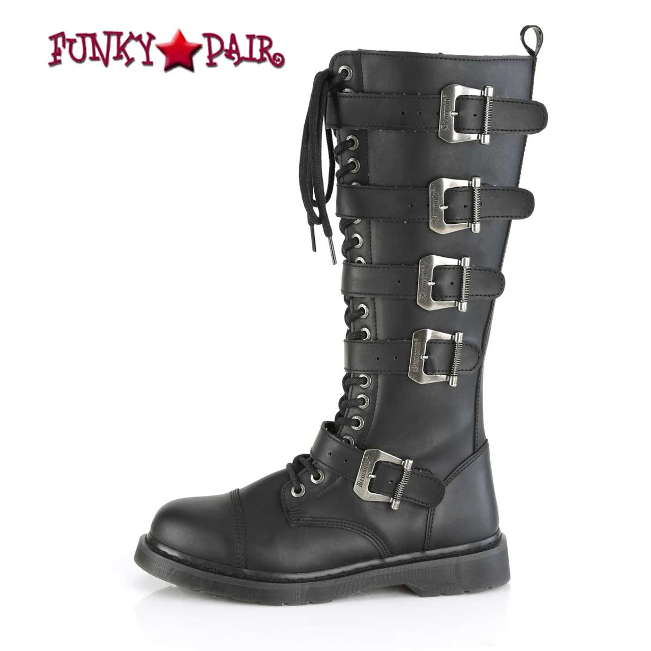 Demonia Men’s BOLT-425, Approximately 1 1/4″ (32mm) Heel 20 Eyelet Unisex Knee High Combat Boot Featuring 5 Buckle Straps, Inside Zip Closure