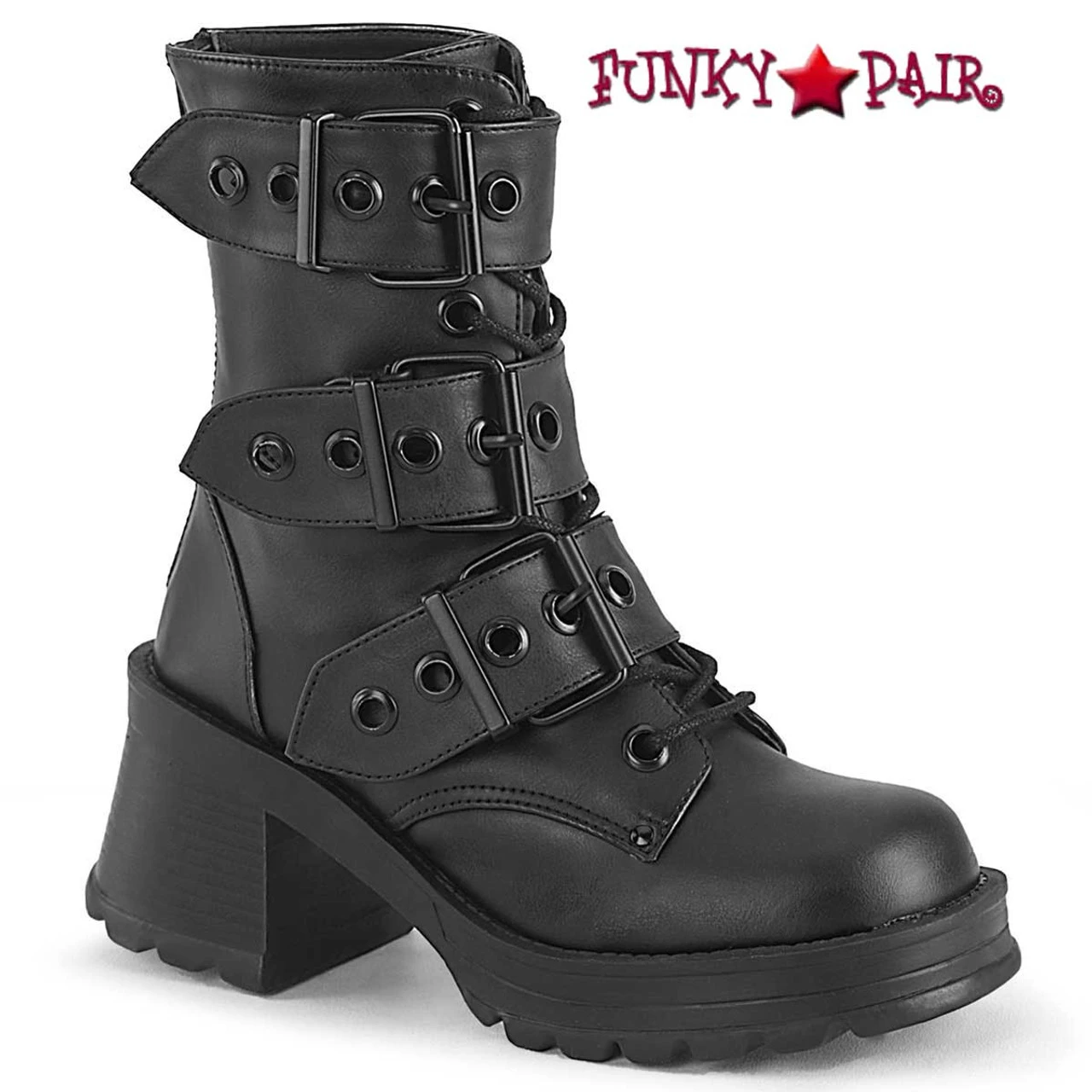 The BRATTY-118 is a unique lace-up ankle boot with a sleek design that combines triple eyeletted buckle straps, a metal back zip closure and a sturdy 70mm chunky heel and 25mm platform for extra stability and comfort.