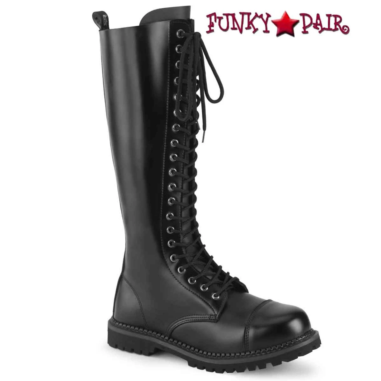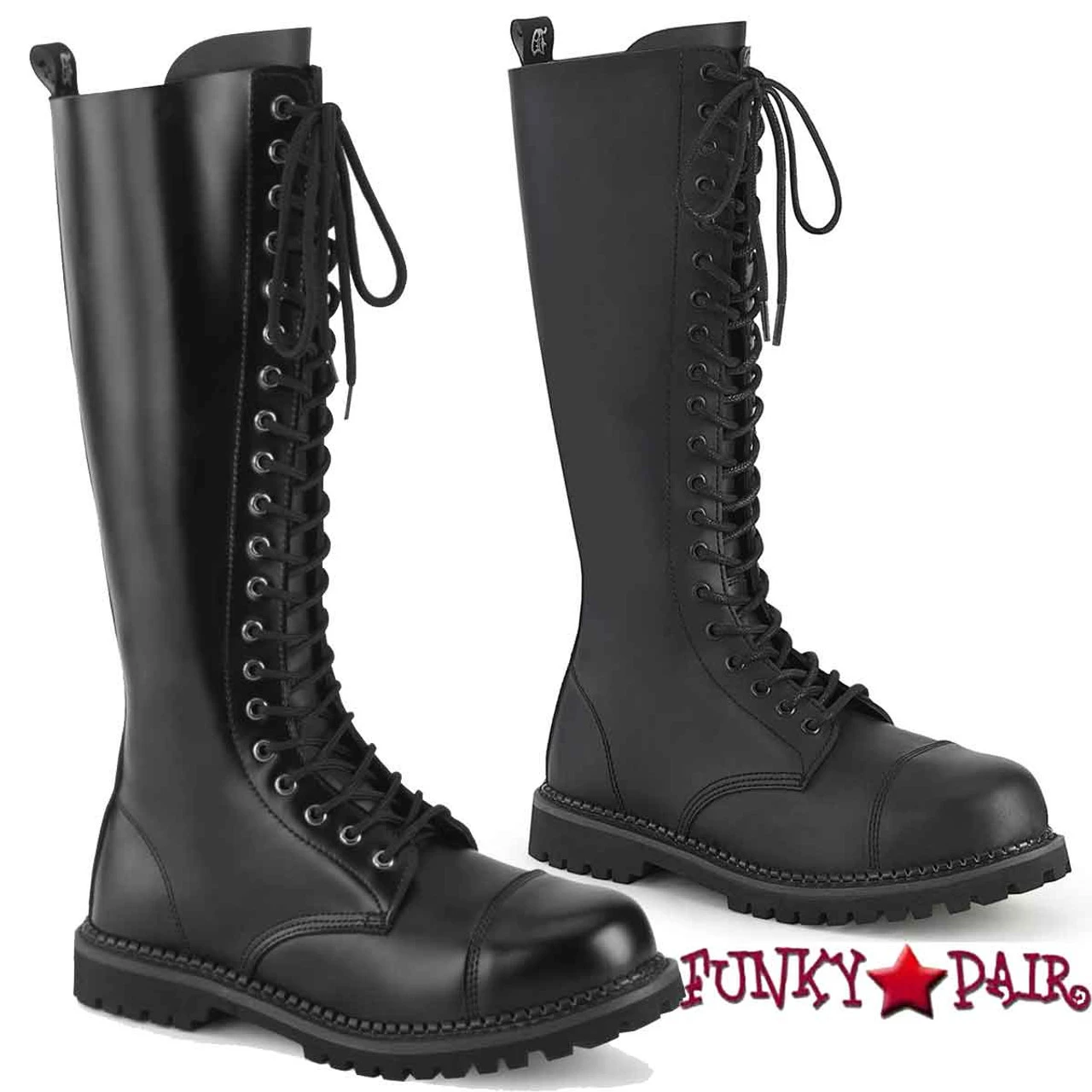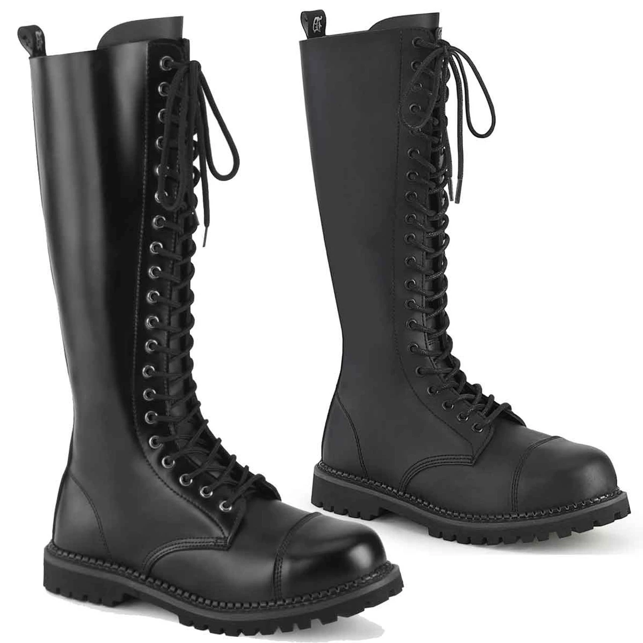 Men Demonia Boots RIOT-20 –Â Â 20 Eyelet Unisex Vegan Steel Toe Lace-Up Knee Boot, Rubber Sole