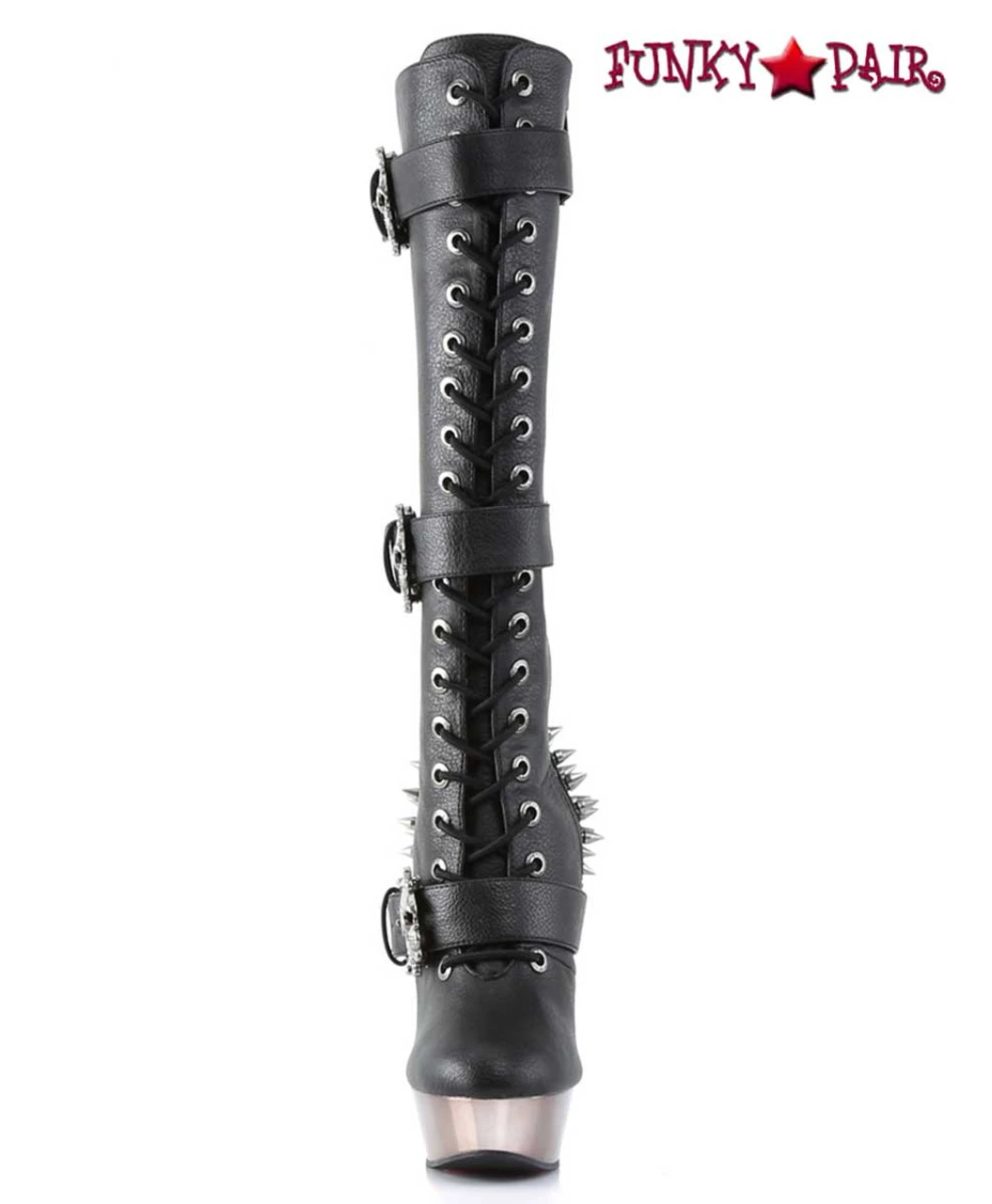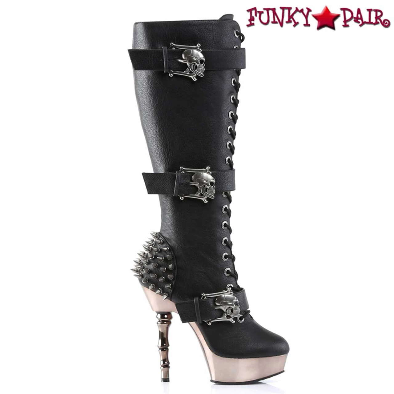 The MUERTO-2028 boots are perfect for a daring look. These boots feature a 5.5 inch finger bone heel with a 1.5 inch platform, and are completed with spiked studding and a side zip. Make a bold statement with these stylish and edgy boots.