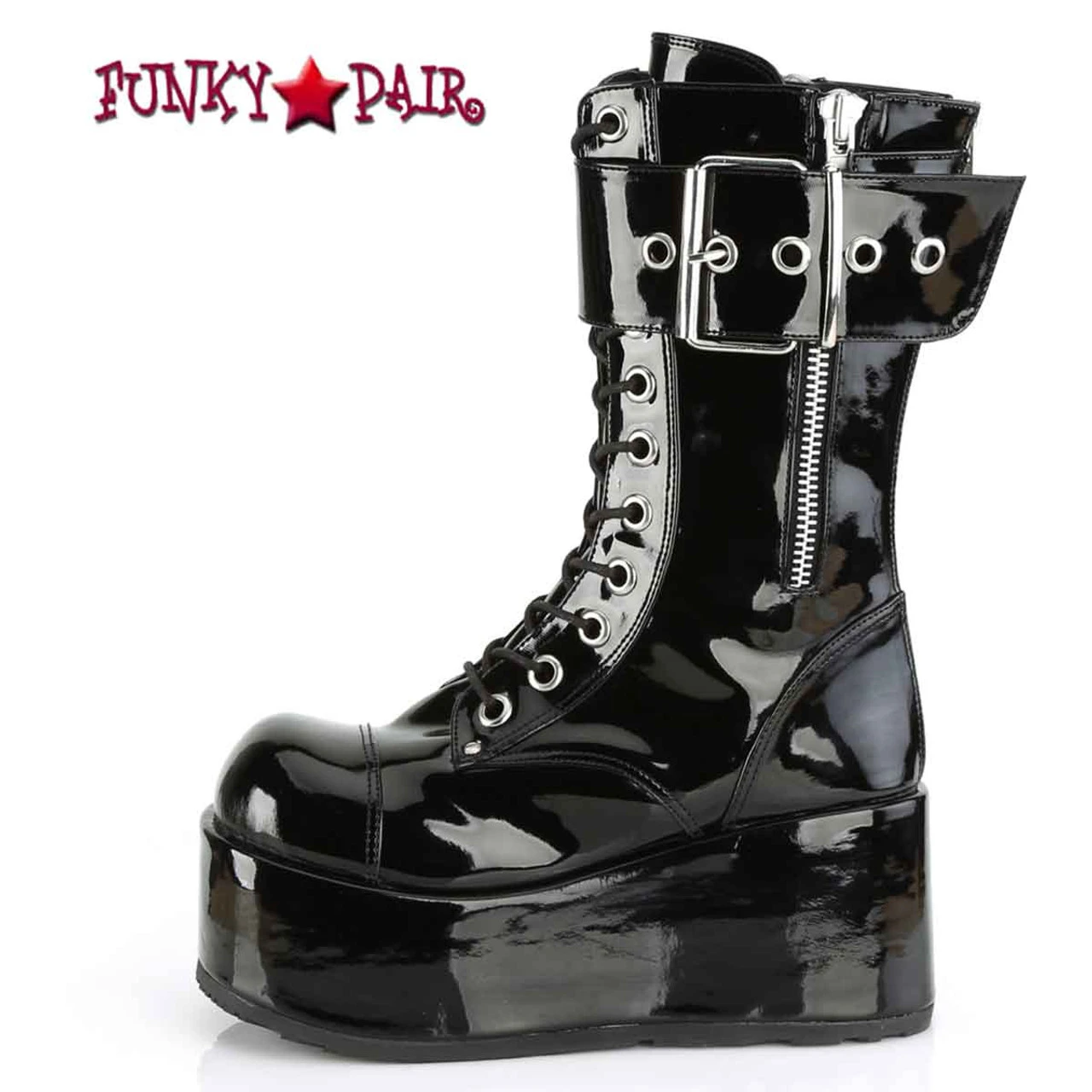 Demonia Men’s Petrol-150 Approximately 3 1/2″ (90mm) Platform Lace-Up Mid-Calf Boot Featuring Ornamental Inner & Outer Zipper Details and Oversize Buckle Strap, Back Zip Closure