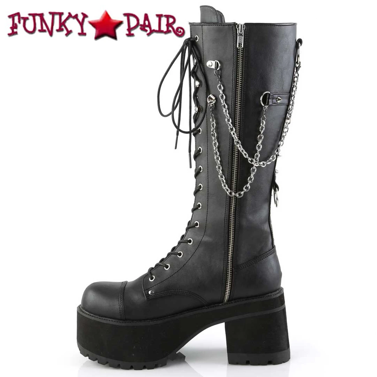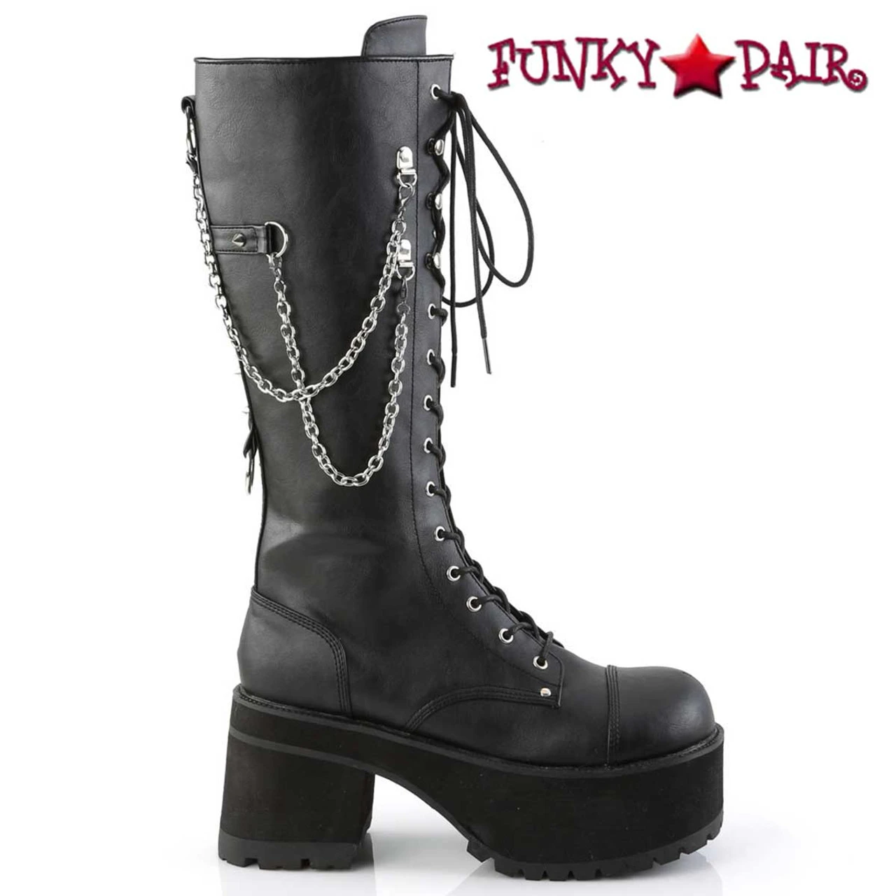 Demonia Women’s Ranger-303 Approximately 3.75 Inch (95mm) Heel, 2.25 Inch (57mm) Platform Lace-Up Front Knee High Boot Featurning Silver Chains and Studded Back Strap with O-Rings, Inside Zip Closure