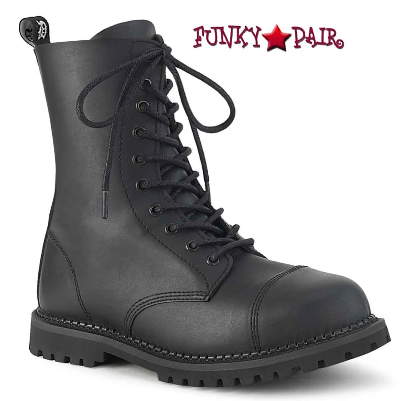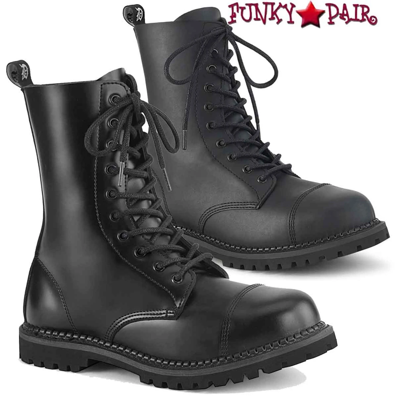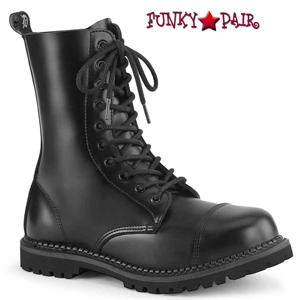 Demonia 10 Eyelet Unisex Leather Steel Toe Lace-Up Ankle Boot, Rubber Sole, Full Length Inside Zip Closure.