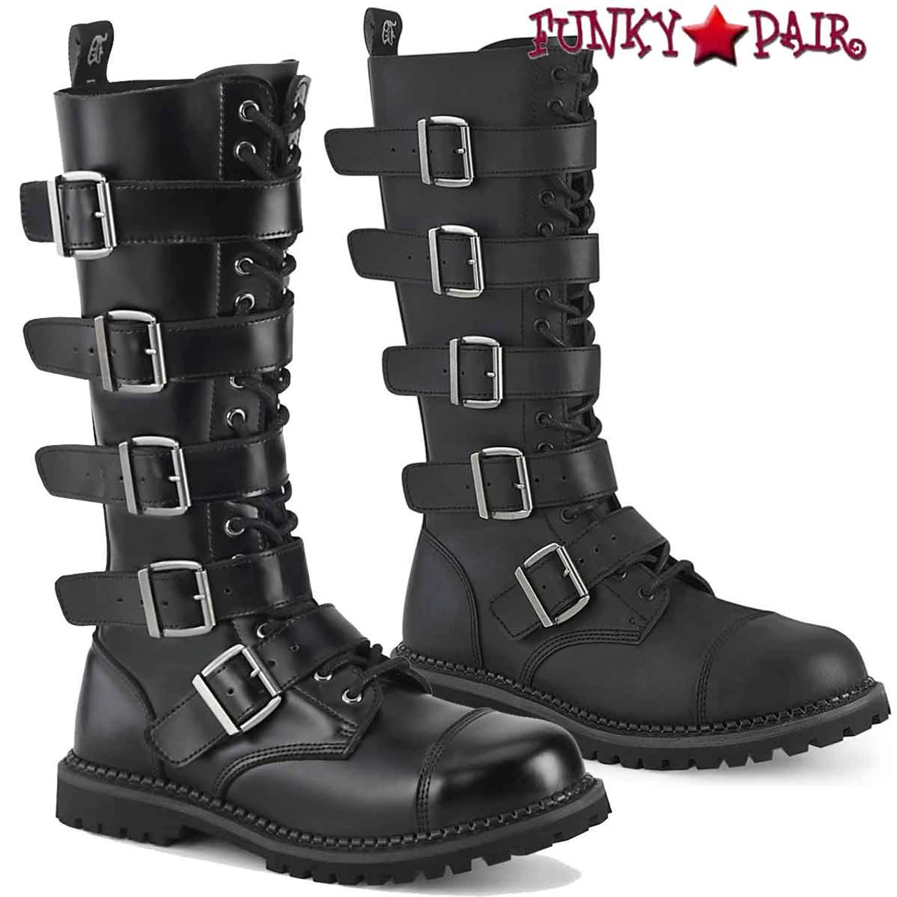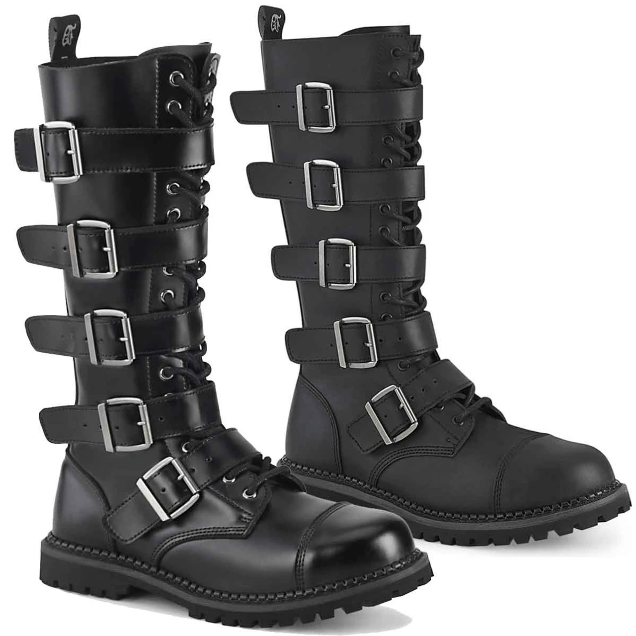Demonia 18 Eyelet Unisex Vegan Steel Toe Lace-Up 5 Buckle Knee Boot, Rubber Sole, Full Length Inside Zip Closure