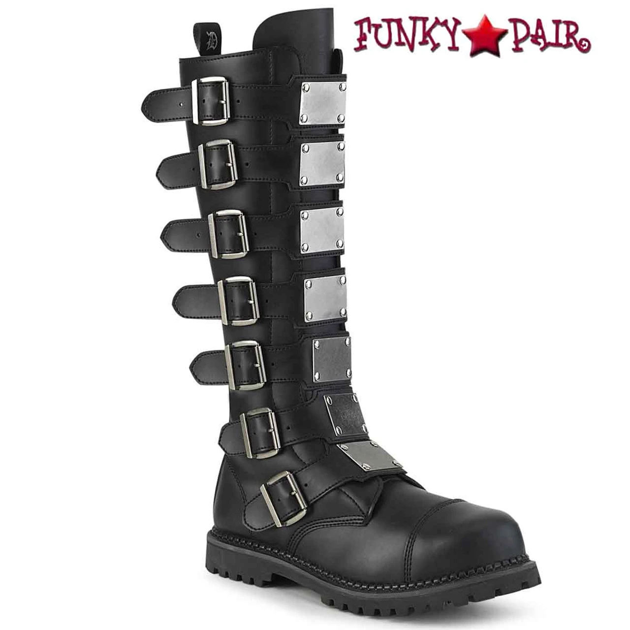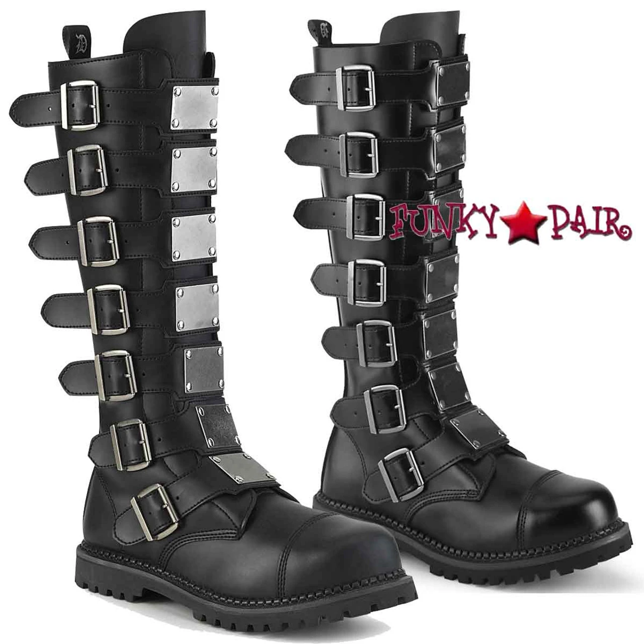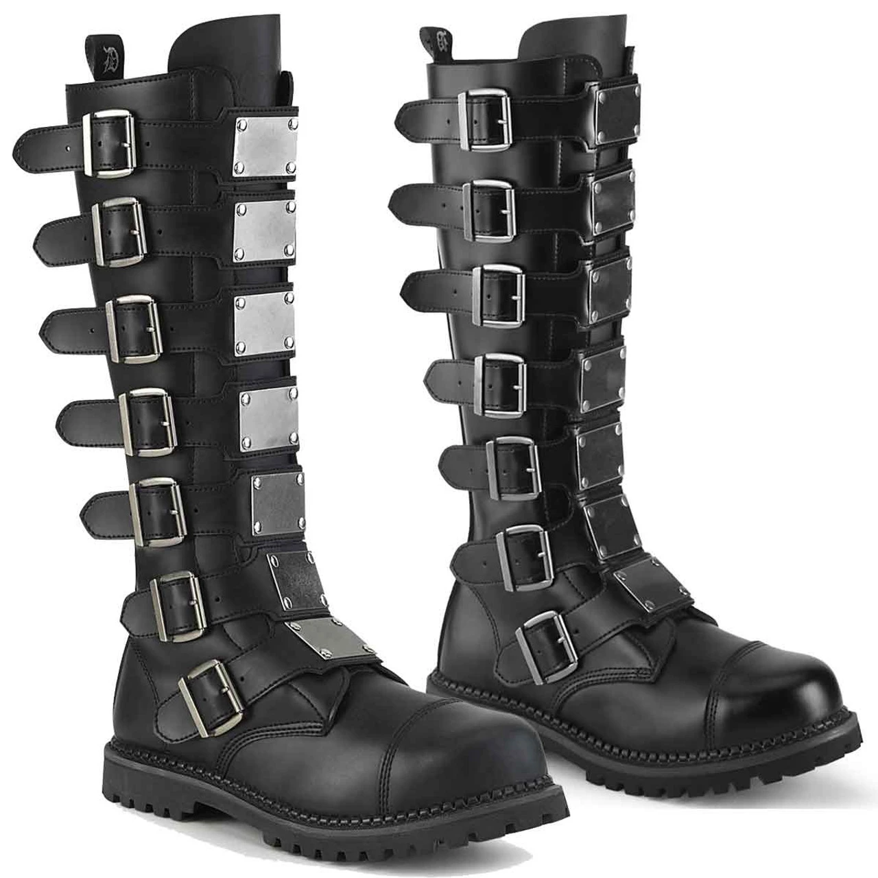 Demonia Unisex Leather Steel Toe Knee Boot Featuring Multiple Buckles & Front Metal Plates, Rubber Sole, Full Length Inside Zip Closure