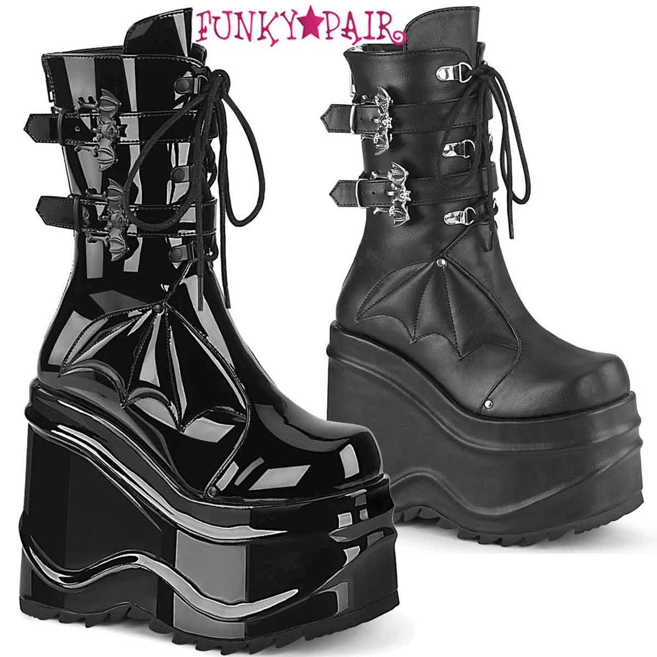 Elevate your wardrobe with the WAVE-150 Gothic Wedge Platform Boots, featuring eye-catching bat buckles for a unique look. With their sleek style and sturdy platform, these boots are perfect for night-time festivities or when you want to add some edge to your outfit.