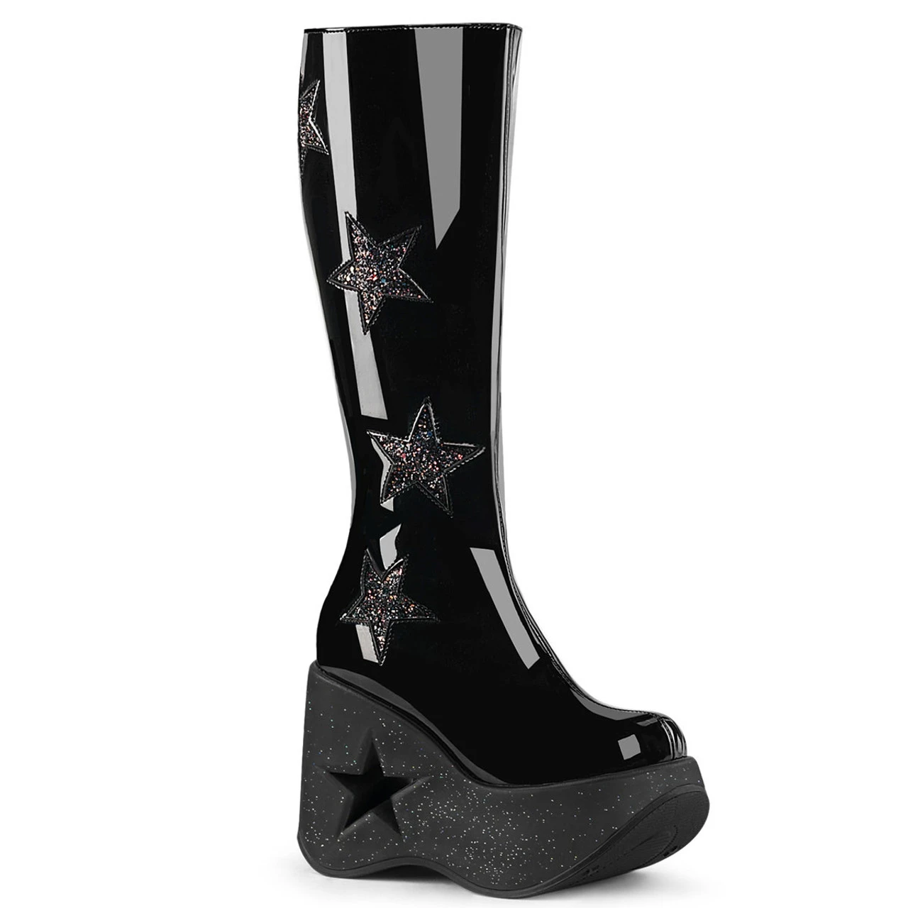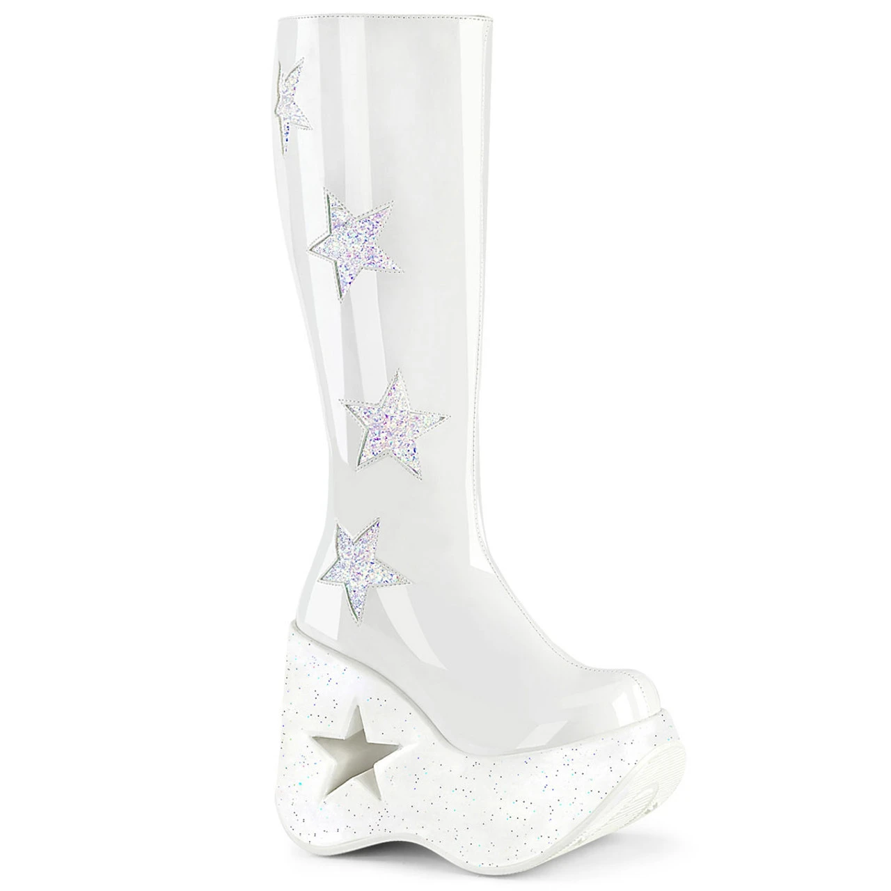 Be a showstopper in these DYNAMITE-218 Cutout Star Platform Knee High Boots, sure to start a style revolution at any rave! Stand out with the star cutouts on the platform sole and rock out in comfort with the soft faux leather lining. Strike a pose in these knee-high statement boots – and let your style take flight!