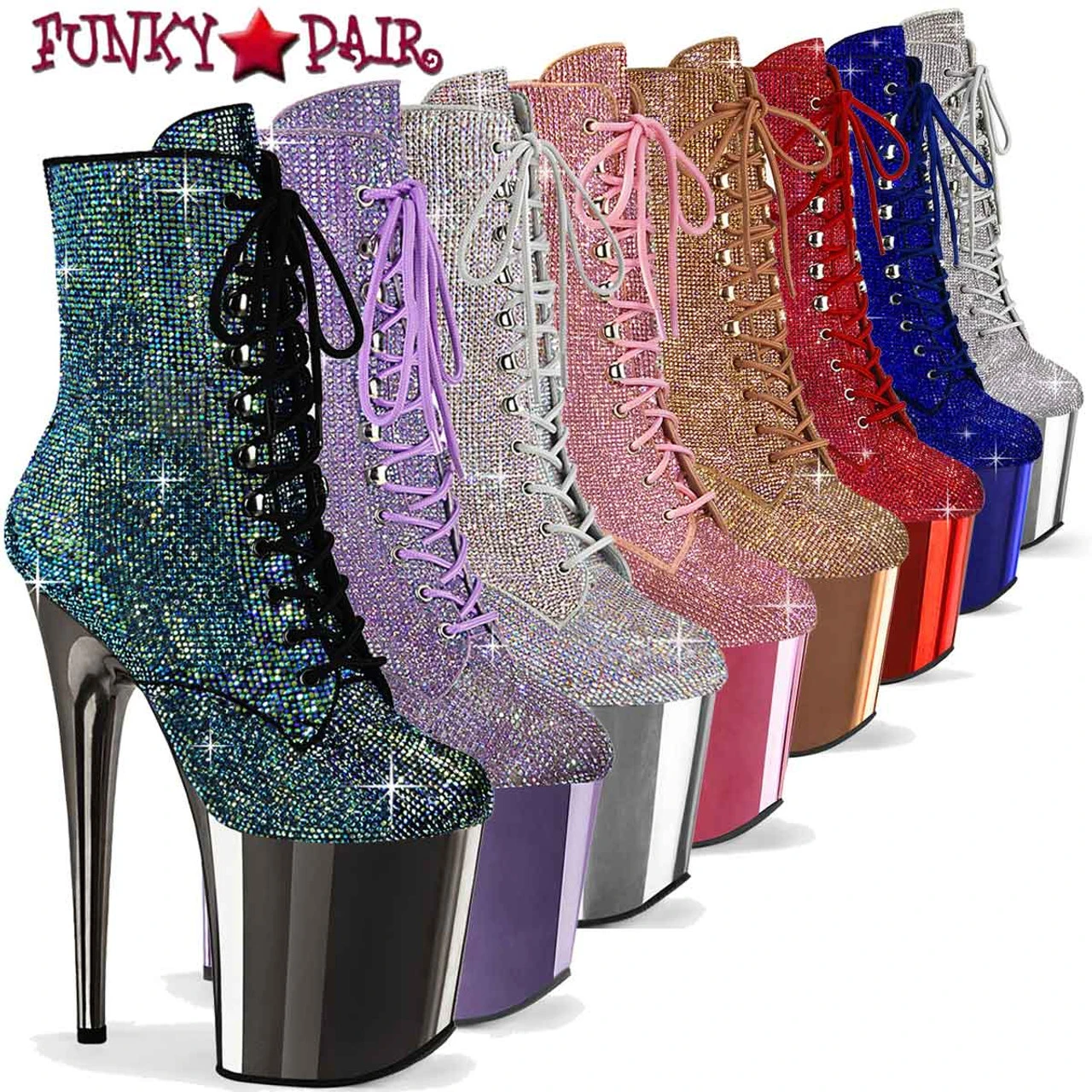 Lace-Up Front Ankle Boot Featuring Allover Blanketed Rhinestone Embellishments on Upper and Chrome Plated Platform Bottom, Inside Zip Closure. Approximately 8″ (200mm) Heel, 4″ (100mm) Platform