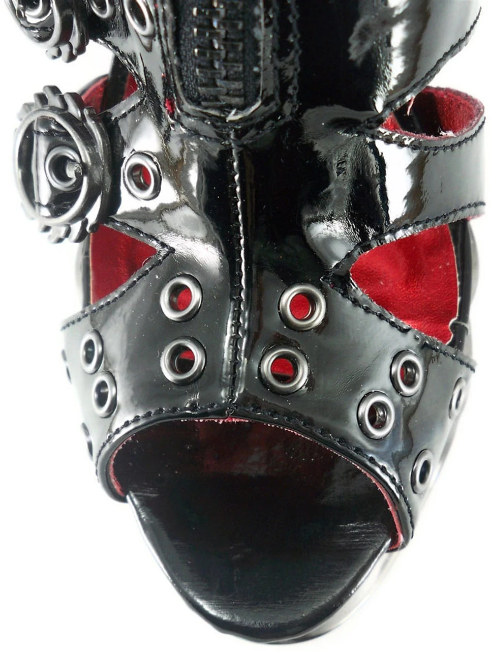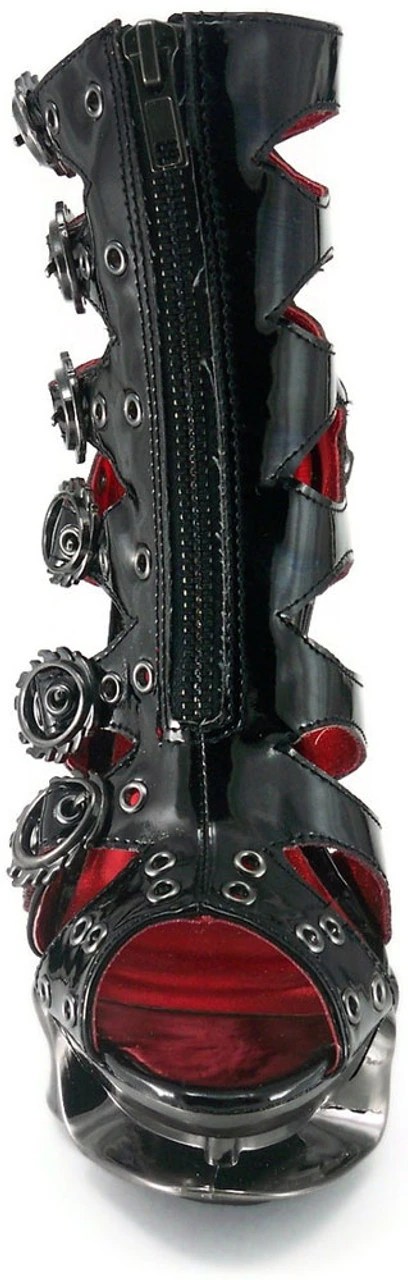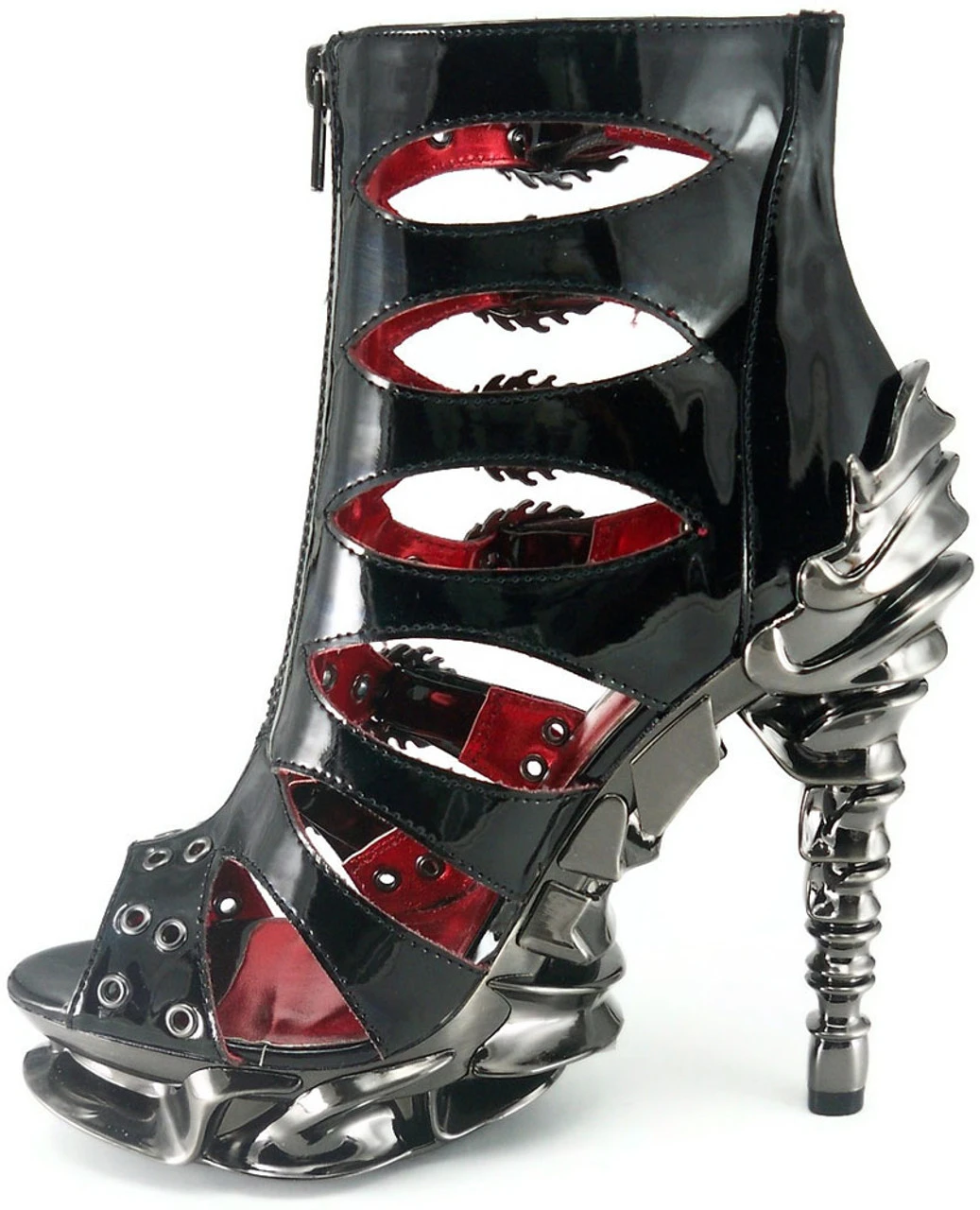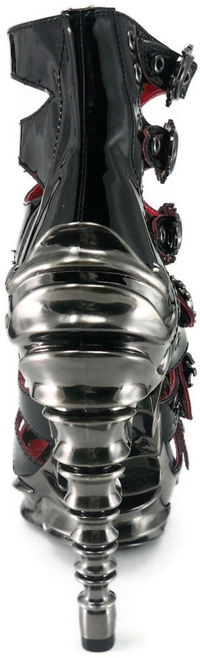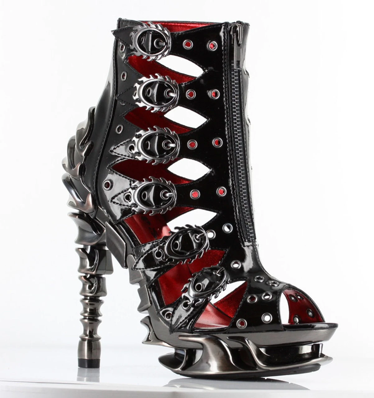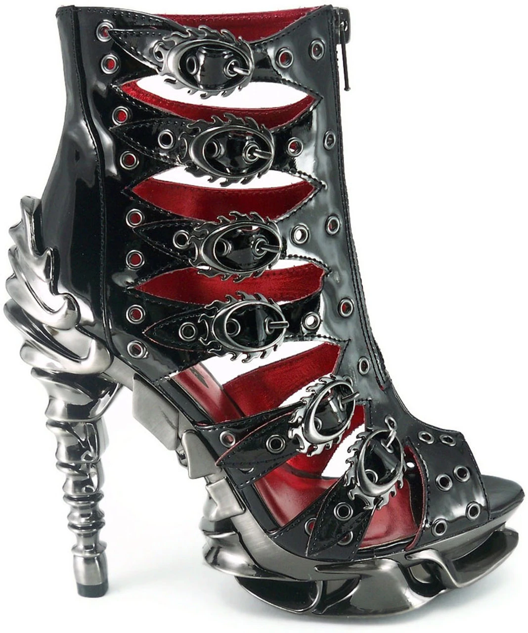 Hades Footwear | Crimson 5 Inch Chrome plated multi-piece spinal heel. 6 adjustable flame buckles with front zipper & multiple eyelets.