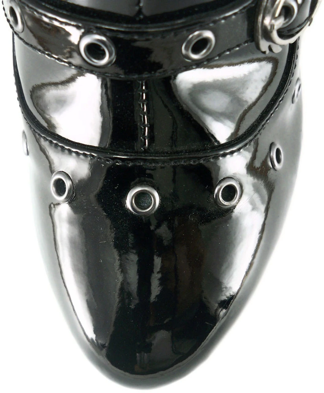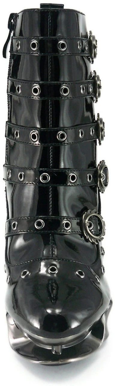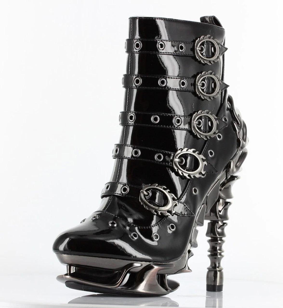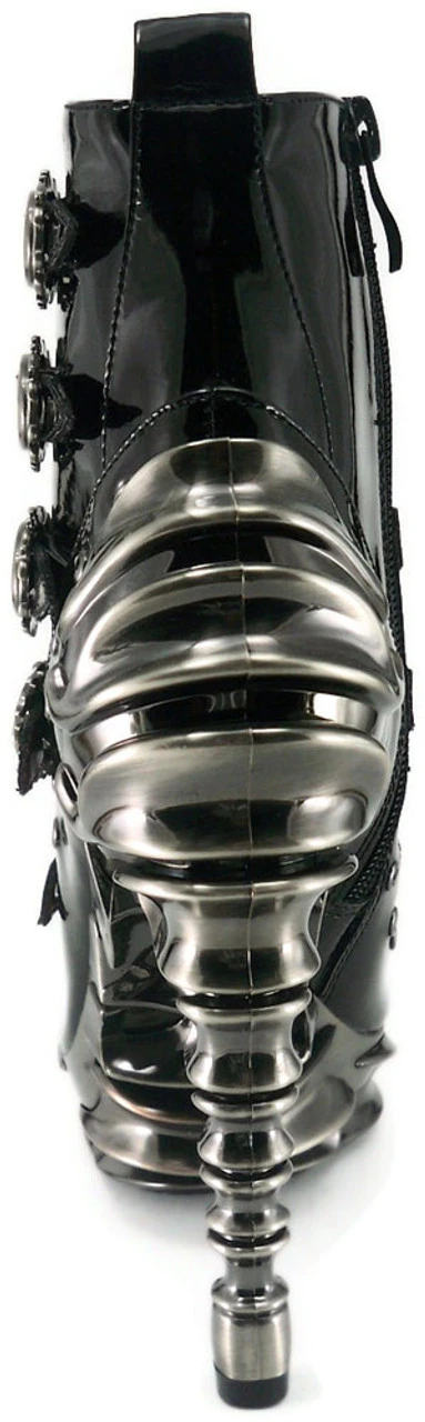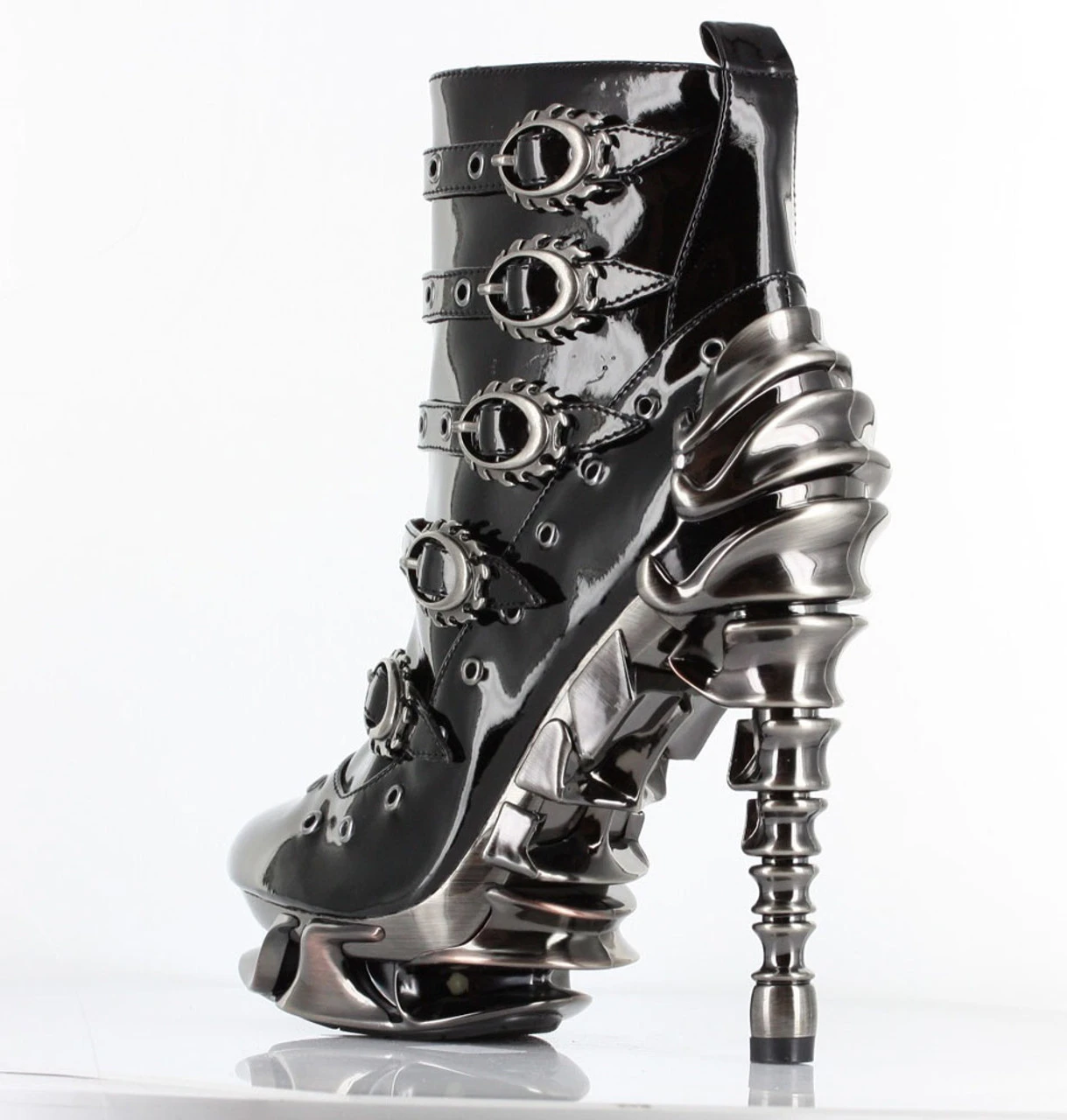Hades Footwear | Machina Chrome plated multi-piece spinal heel. Ankle Bootsie with inner zipper. 5 adjustable custom flame buckles adorned with silver eyelets.