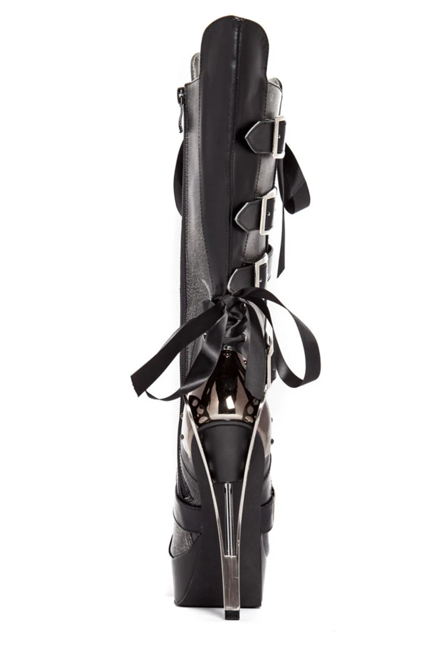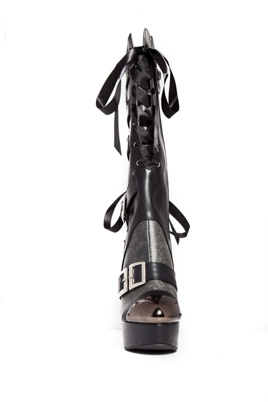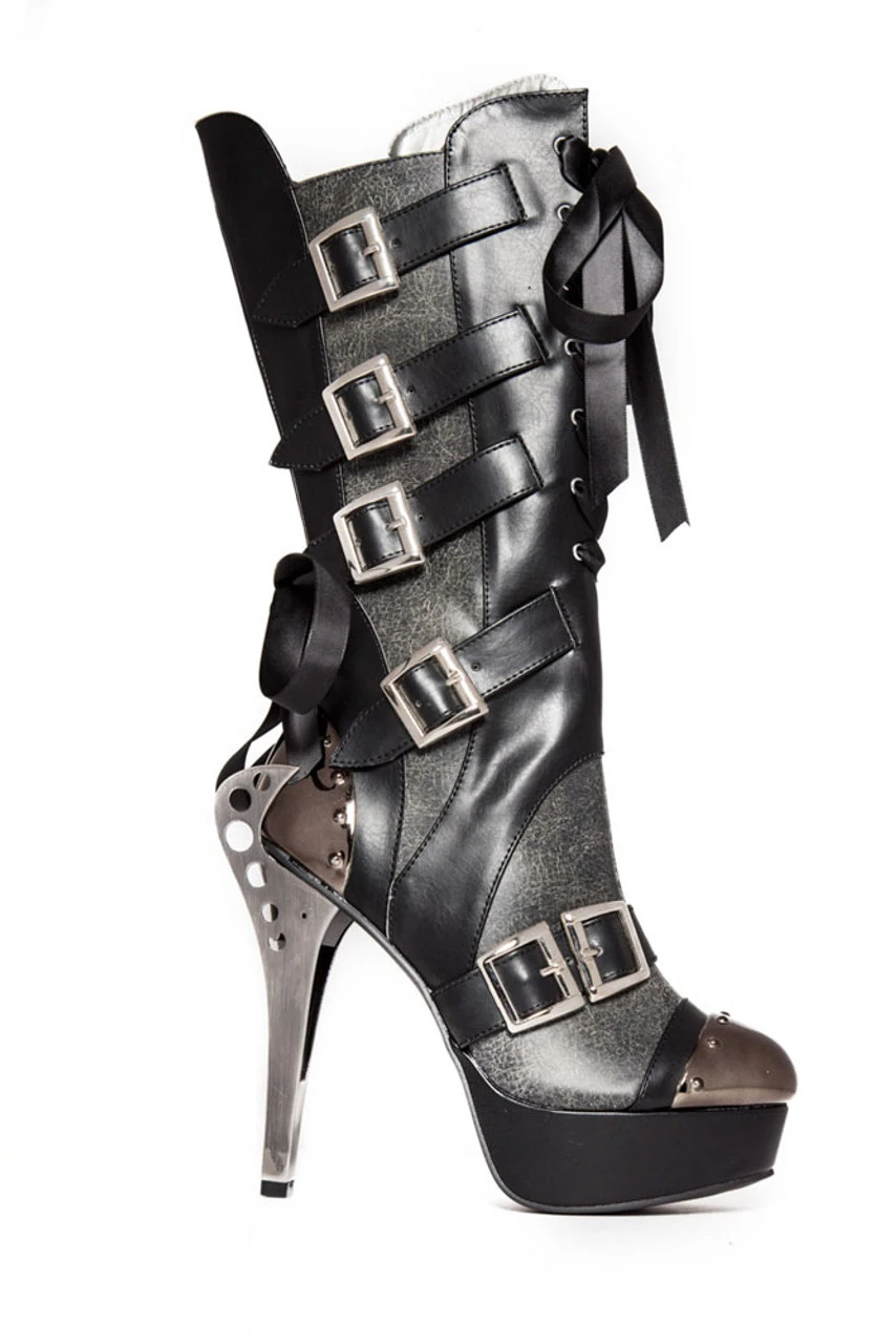 Hades Footwear | LIV Knee high ankle bootie. Steampunk inspired industrial metal heel. Metal toe cap. 5? heel height. Inner zipper. Interchangeable satin lace on front and back. Adjustable side buckles.metal heel, metal toe cap, 5″ heel height, inner zipper, interchangeable satin lace on front and back w/ adjustable side buckles