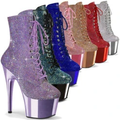 7″ (178mm) Heel, 2 3/4″ (70mm) Platform Lace-Up Front Ankle Boot Featuring Chrome Plated Platform Bottom and Allover Blanketed Rhinestone Embellishments on the Upper, Inside Zip Closure