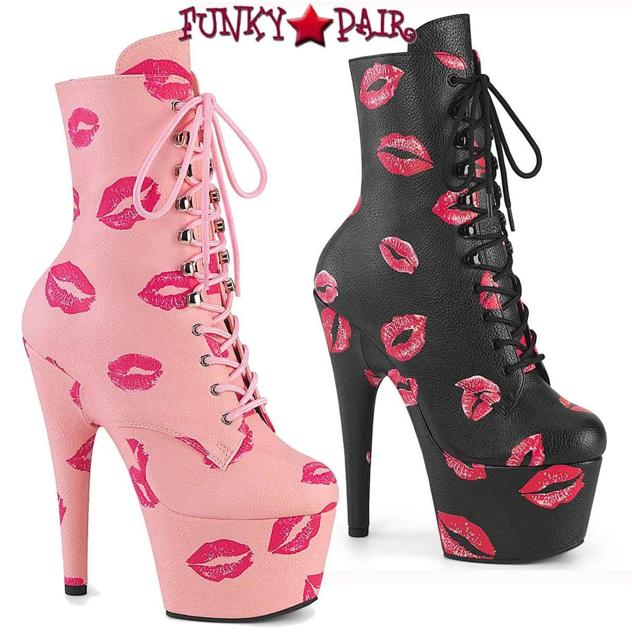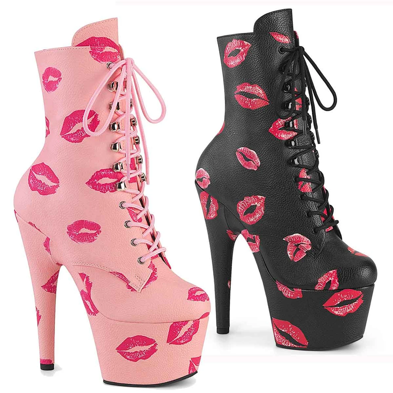 7″ (178mm) Heel, 2 3/4″ (70mm) Platform Lace-Up Front Ankle Boot Featuring Red Lips Print Upper and Matching Wrapped Platform Bottom, Inner Side Zip Closure