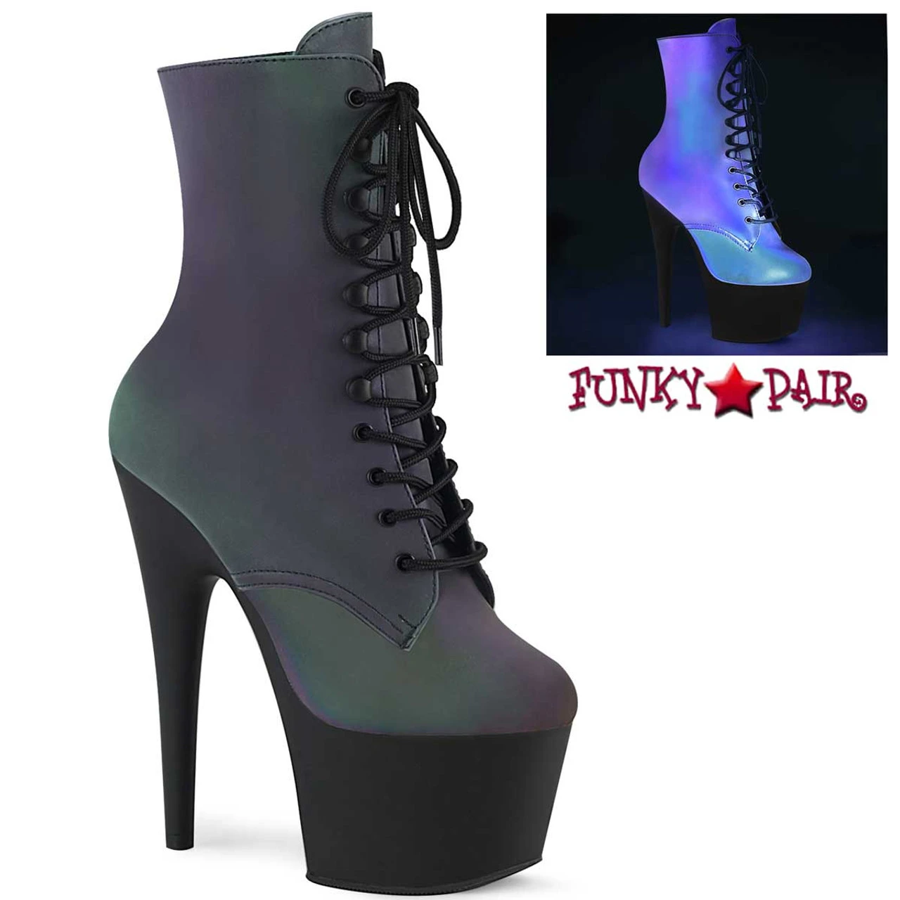 Pleaser Adore-1020REFL Lace-Up Ankle Boot Featuring Reflective Upper, Inside Zip Closure Approximately 7 Inch (178mm) Heel, 2 3/4″ (70mm) Platform