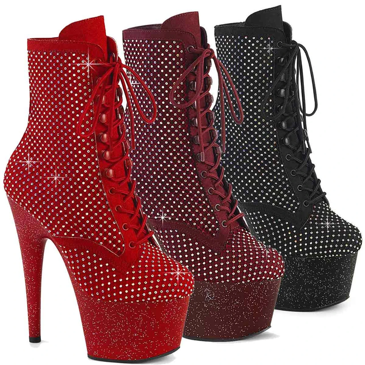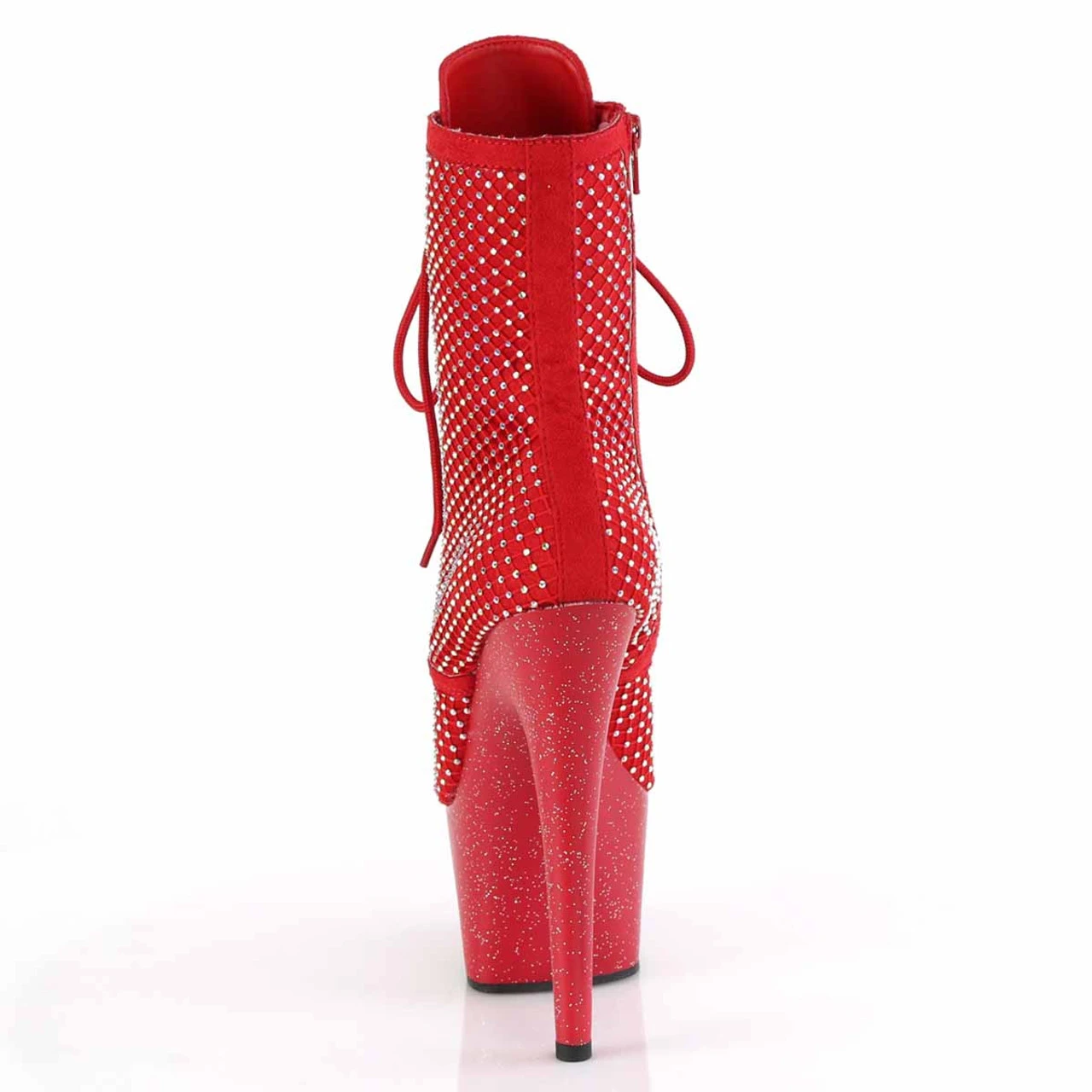 7″ (178mm) Heel, 2 3/4″ (70mm) Platform Lace-Up Front Ankle Boot Featuring AB Rhinestone Mesh Overlay Upper and Mini Iridescent Glitters All Over the Entire Platform Bottom, Inner Side Zip Closure