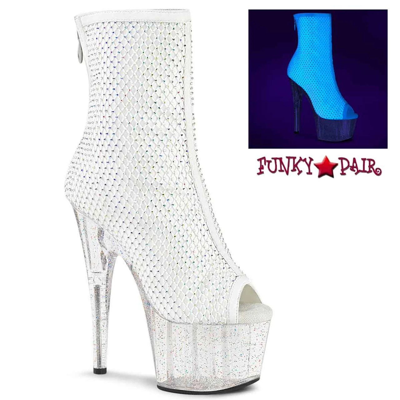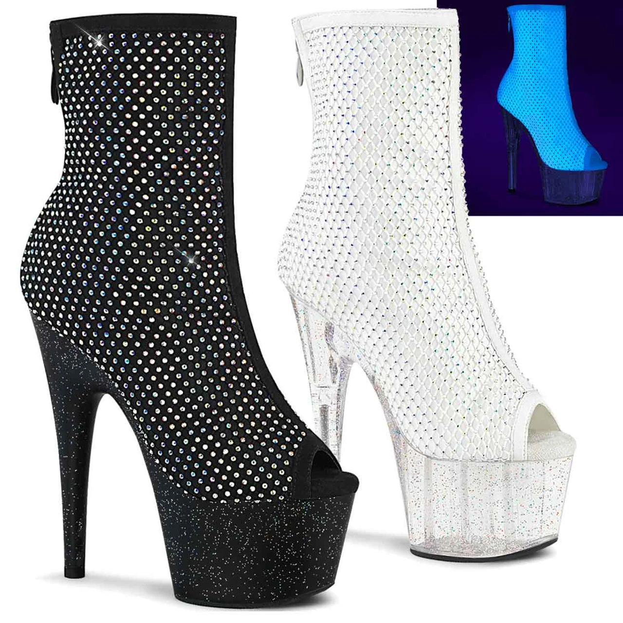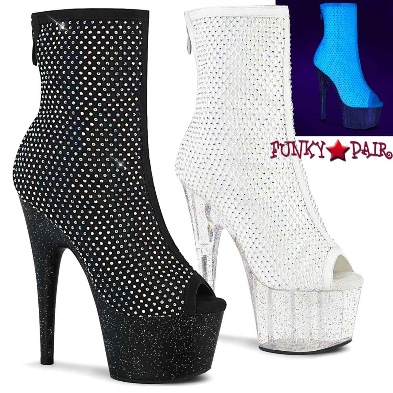 7″ (178mm) Heel, 2 3/4″ (70mm) Platform Open Toe Ankle Boot with Mini Multi Rhinestone Upper Featuring Mini Iridescent Glitter on the Entire Platform, Back Zip Closure