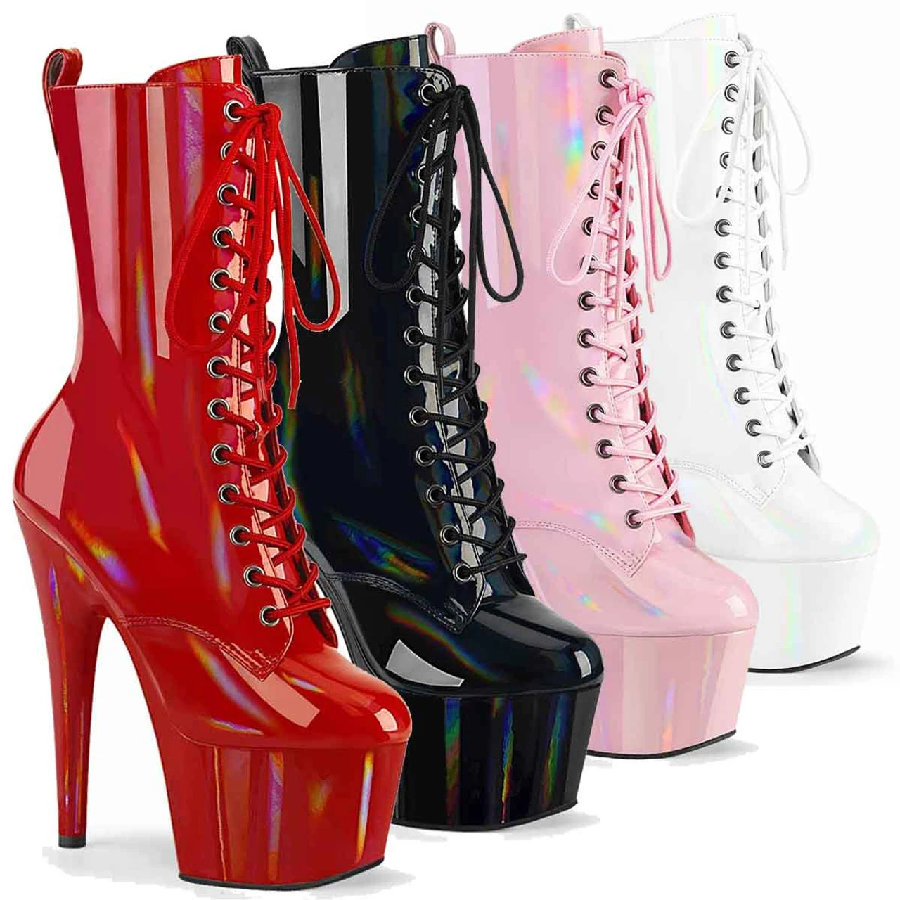Approximately 7″ (178mm) Heel, 2 3/4″ (70mm) Platform Holographic Lace-Up Front Ankle Boot Featuring Fully Wrapped Matching Platform Bottom, Inner Side Zip Closure