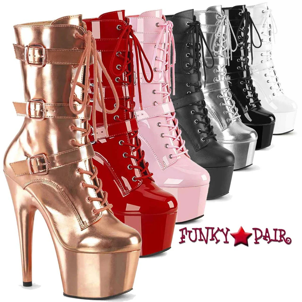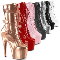 Approximately 7″ (178mm) Heel, 2 3/4″ (70mm) Platform Lace-Up Front Ankle Boot Featuring Triple Buckle Straps & Fully Wrapped Platform Bottom, Inner Side Zip Closure