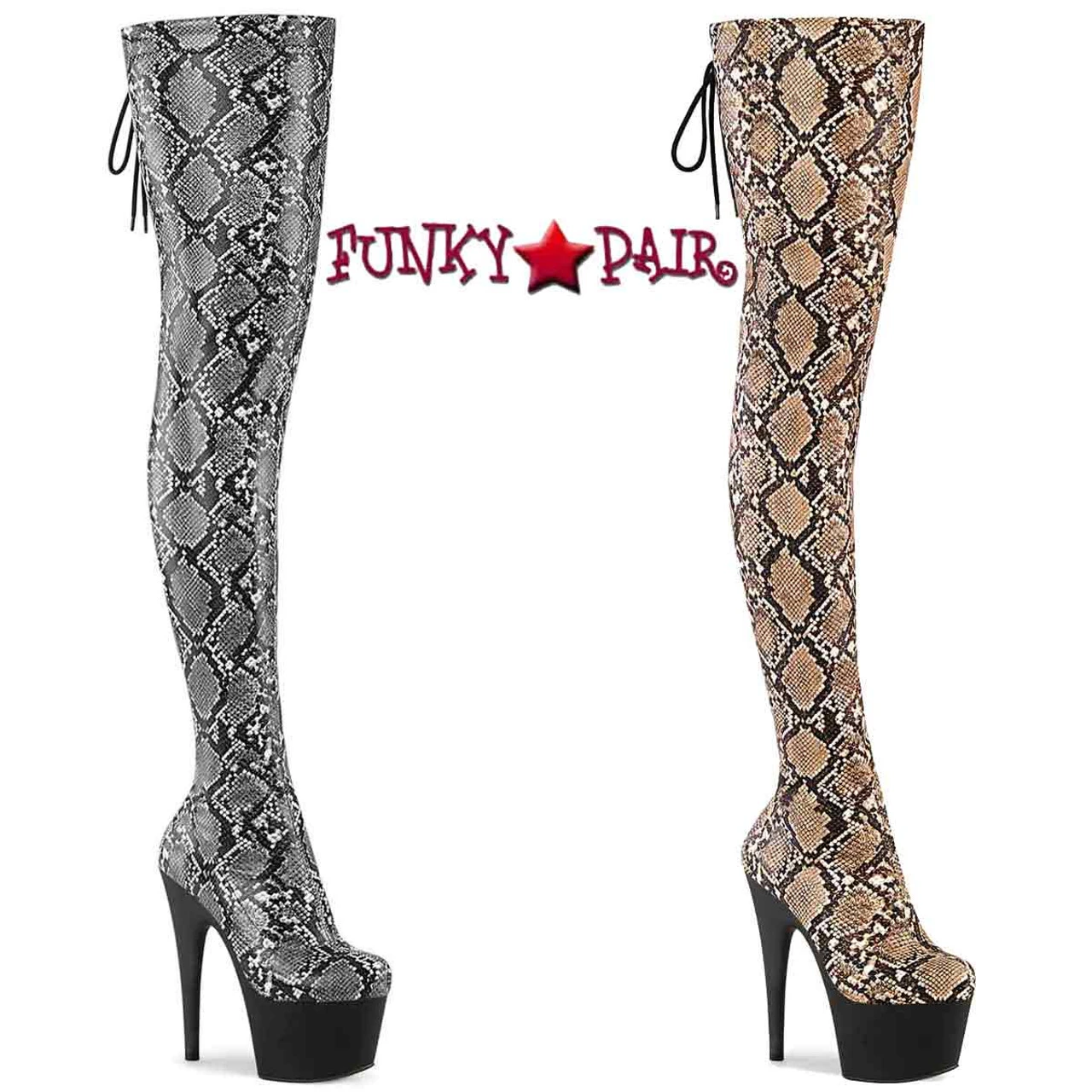 7″ (178mm) Heel, 2 3/4″ (700mm) Stretch Snake Print Pull-On Thigh Boot w/Rear Tie Fastening