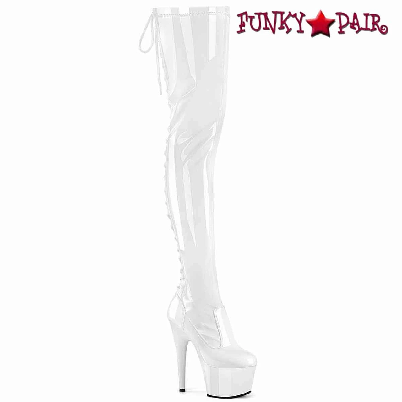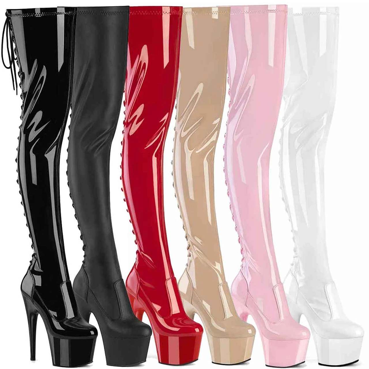 7″ (178mm) Heel, 2 3/4″ (70mm) Platform Stretch Lace-Up Back Thigh High Boot, Full Length Inner Side Zip Closure