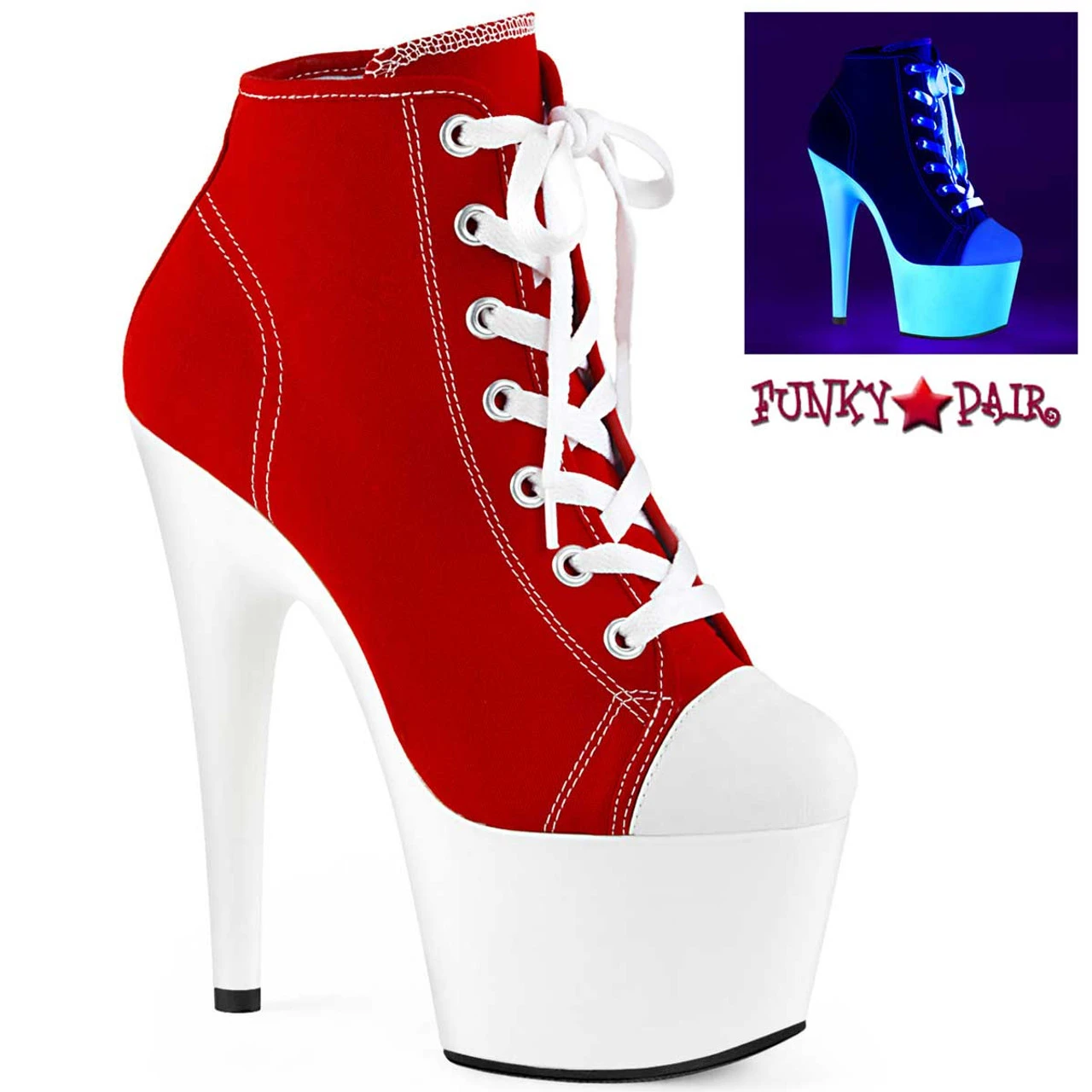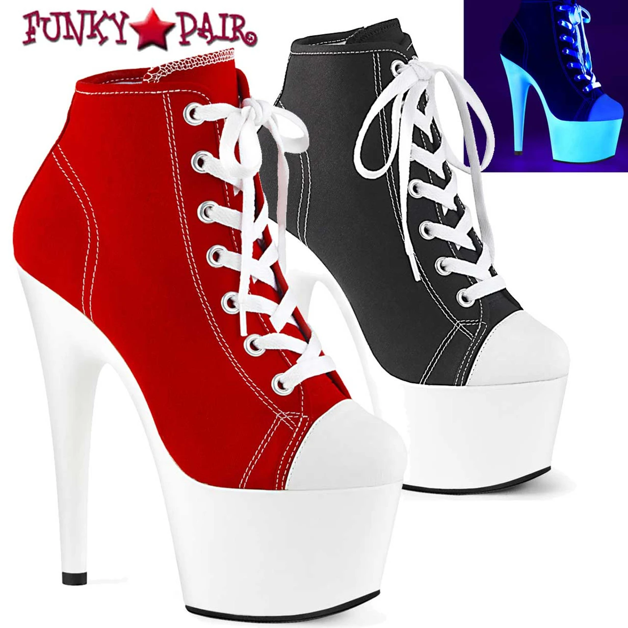 Pleaser Shoes Adore-700SK-02, Approximately 7″ (178mm) Heel, 2 3/4″ (70mm) Platform Lace Up Front Canvas Sneaker Ankle Boots Featuring Black light Reactive Platform Bottom, Full Inside Zip Closure