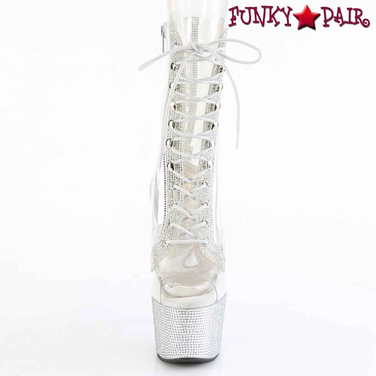 7″ (178mm) Heel, 2 3/4″ (70mm) Platform Peep Toe Lace-Up Front Ankle Boot Featuring Rhinestone Embellishment Along Front and Back Panels and All Over the Entire Platform Bottom, Inner Side Zip Closure