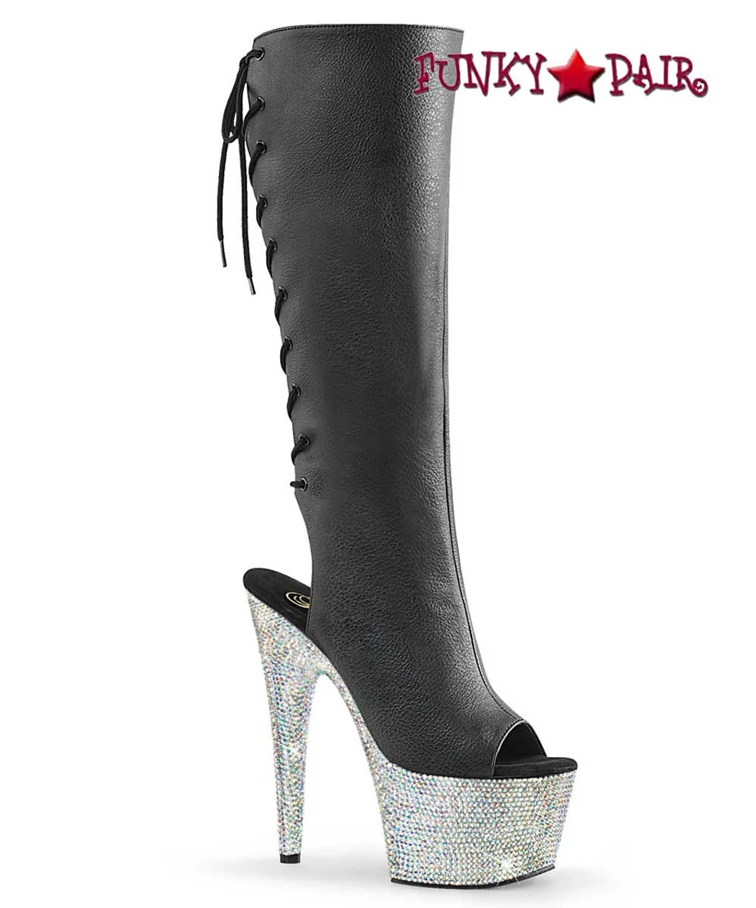 7″ (178mm) Heel, 2 3/4″ (70mm) Platform Open Toe/Heel Lace-Up Back Knee Boot FeaturingSilver AB Rhinestones Encrusted All-Over the Entire Platform Bottom, Inner Side Zip Clousre