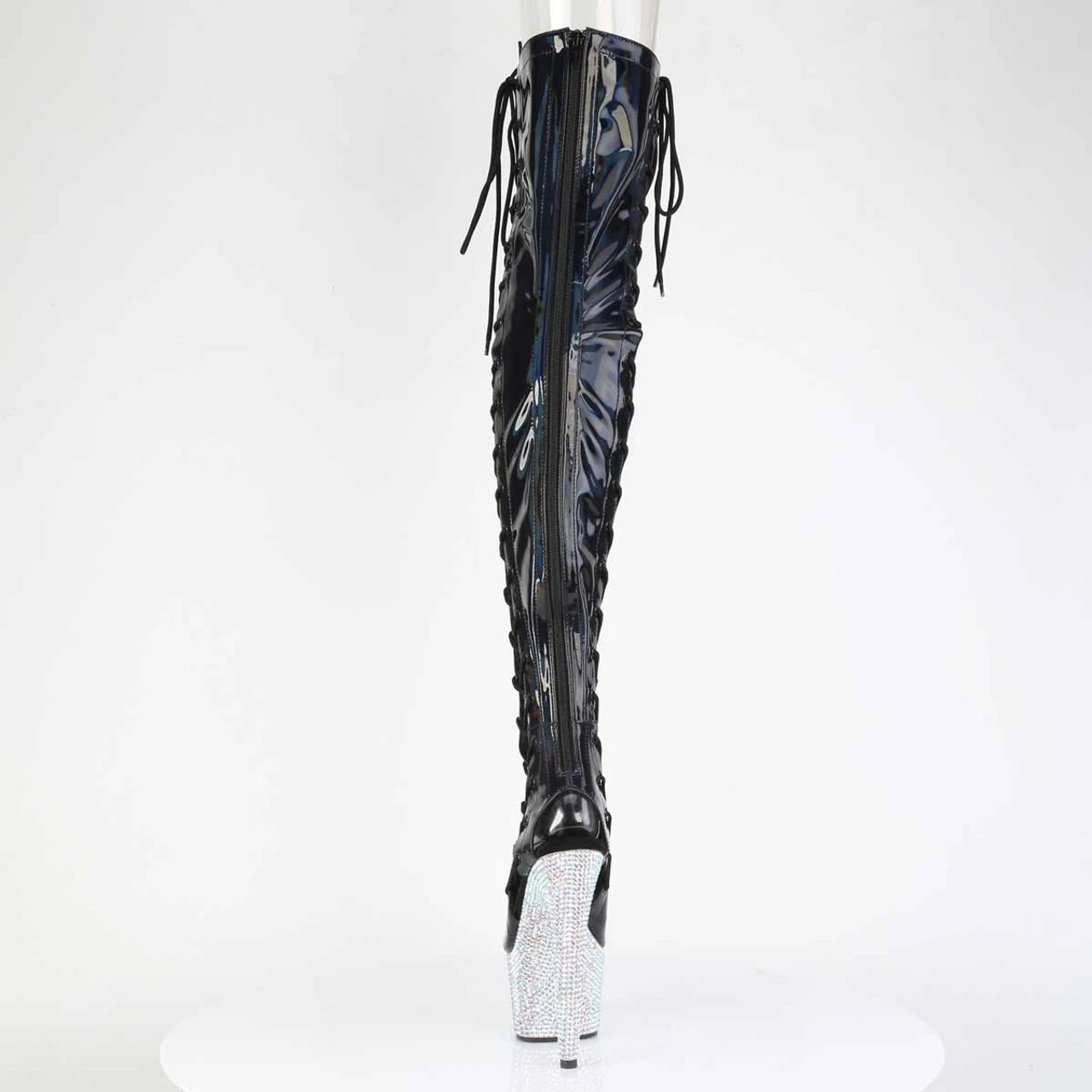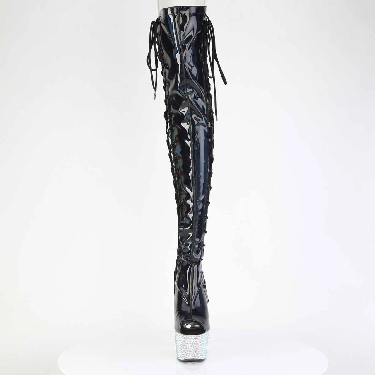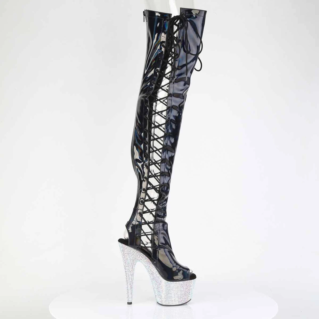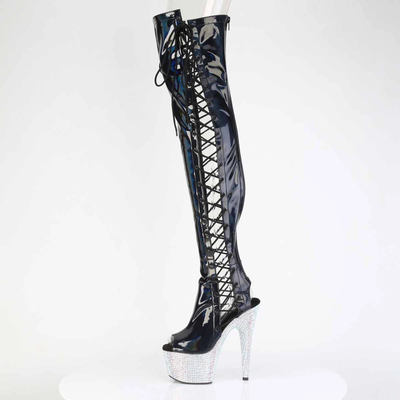 7″ (178mm) Heel, 2 3/4″ (70mm) Platform Open Toe/Back Inner & Outer Side Lace Up Thigh High Boot Featuring Silver AB Rhinestones Covering the Entire Platform Bottom, Full Length Back Zip Closure