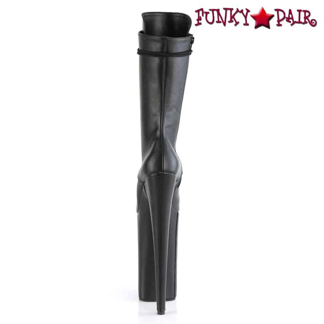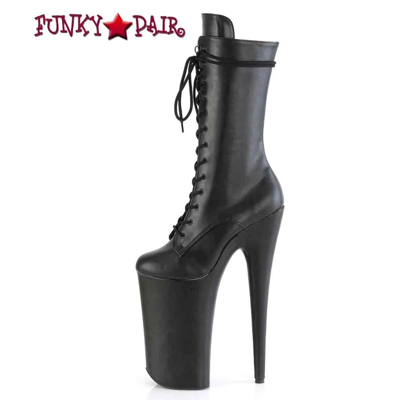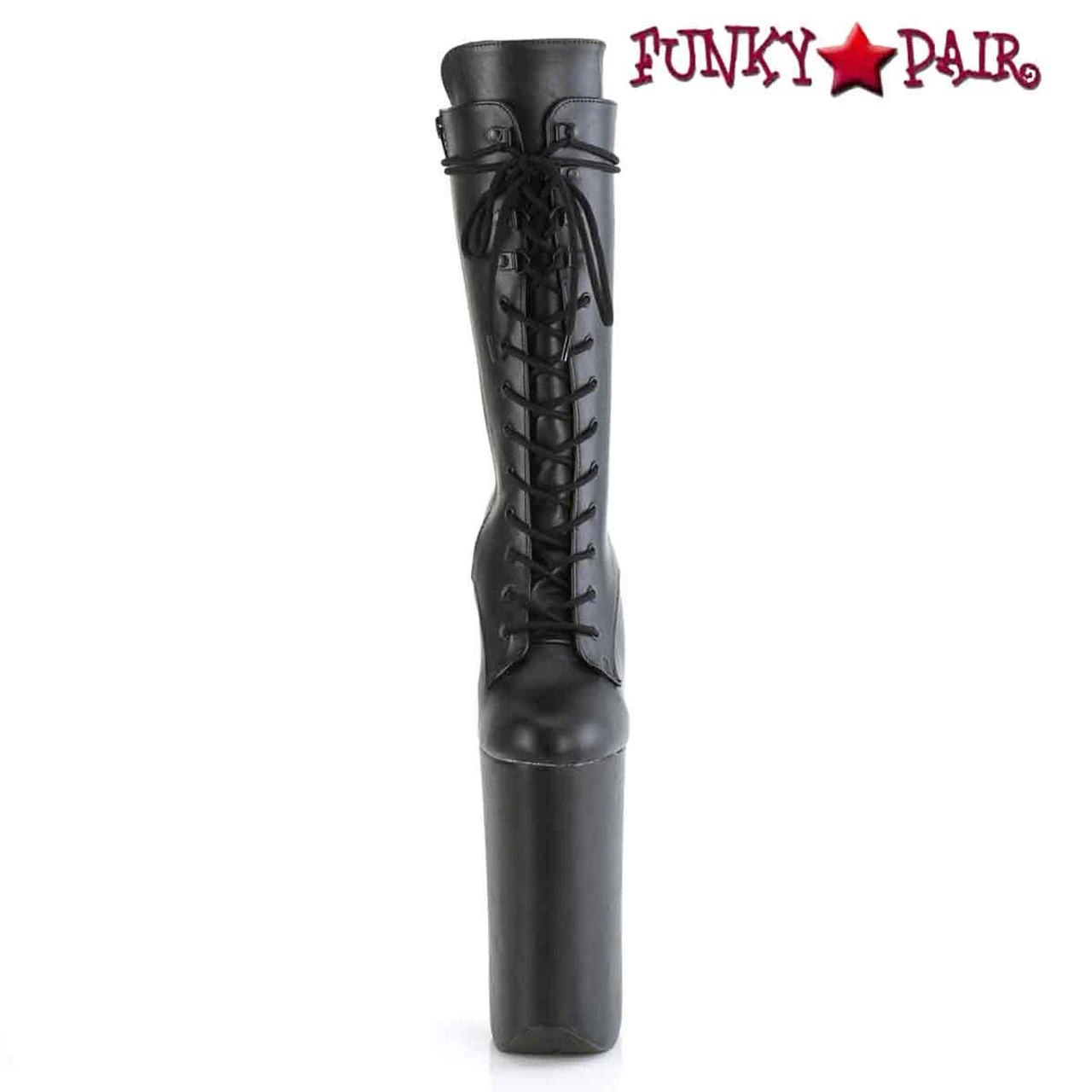 Lace-Up Front Mid Calf Boot Featuring Fully Wrapped Platform Bottom, Inner Side Zip Closure. Warning: Extreme Hight Heels. Not Recommended for Walking or Dancing. Approximately 10″ (255mm) Heel, 6 1/4″ (160mm) Platform