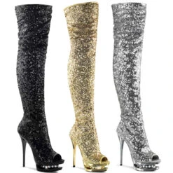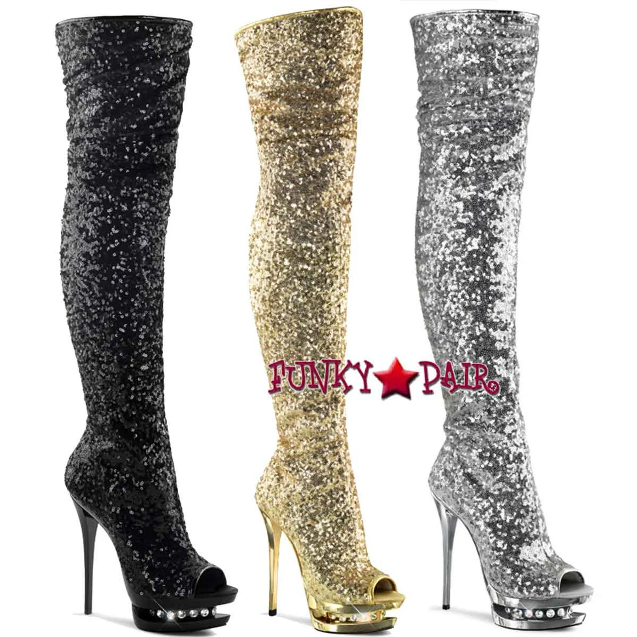 Pleaser Blondie-R-3011 Approximately 6 inch High heel thign High sequin Boots with open toe with rhinestones embellishment on inlay full inner side zipper. Price Range: $119.95 – $128.95