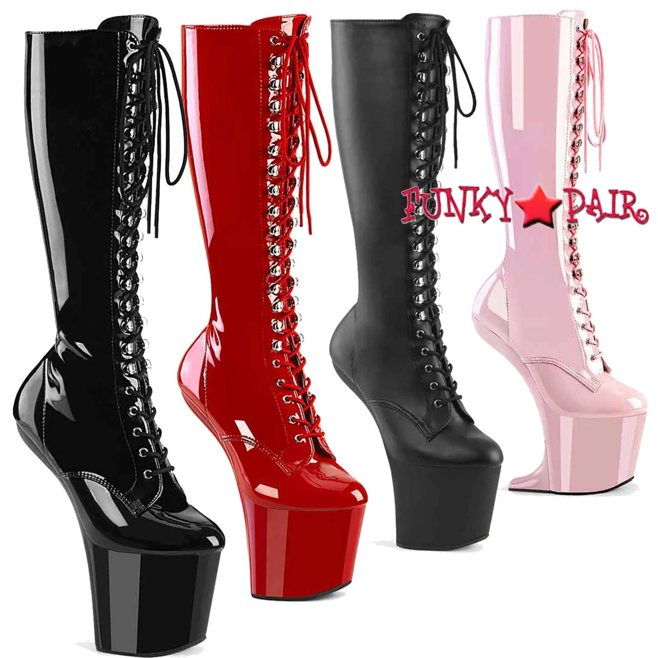 8″ (200mm) Heelless, 3″ (76mm) Platform Lace-Up Front Stretch Knee High Boots, Full Length Inner Side Zip Closure. Convertible to Wedge Boots with Included Heel Attachments. **WARNING: Extreme Height and Unique Heelless Design. Not Recommended for Walking or Dancing.