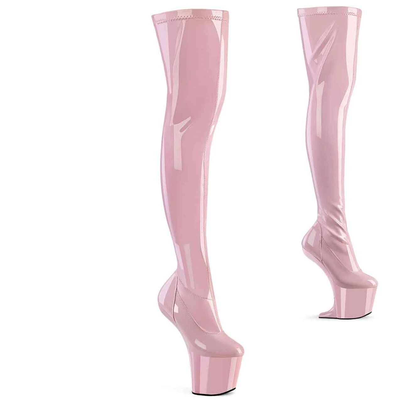 8″ (200mm) Heelless, 3″ (76mm) Platform Stretch Thigh High Boots, 1/2 Inner Side Zip Closure. Convertible to Wedge Boots with Included Heel Attachments. **WARNING: Extreme Height and Unique Heelless Design. Not Recommended for Walking or Dancing.