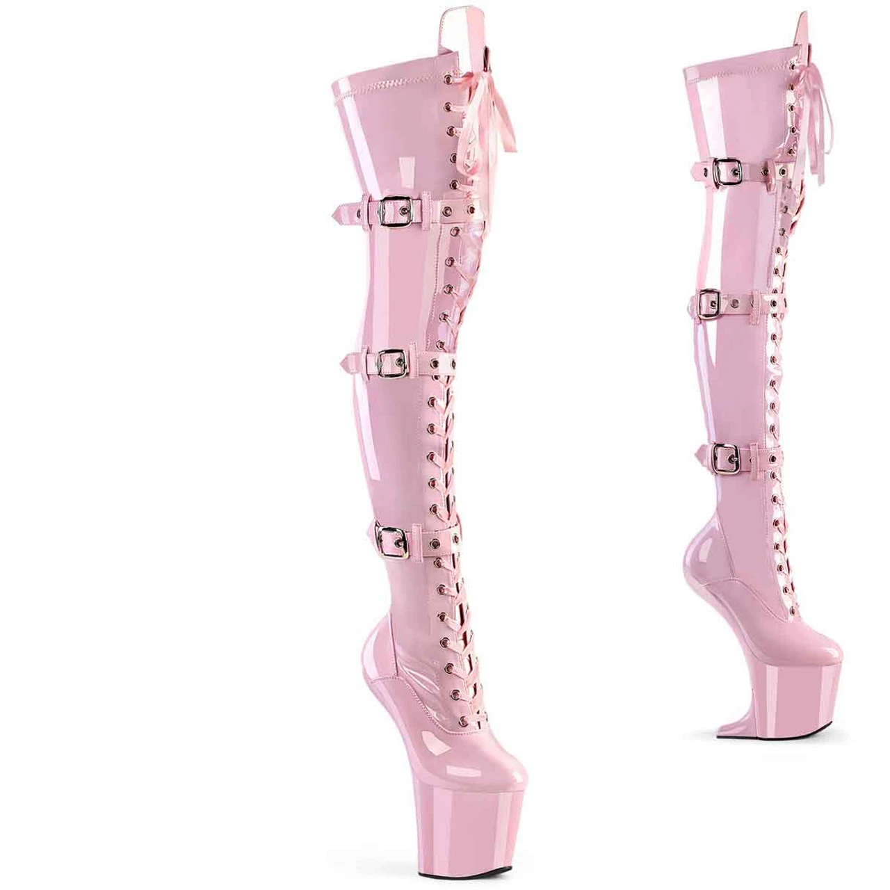 8″ (200mm) Heelless, 3″ (76mm) Platform Stretch Lace-Up Front Triple Buckle Strap Thigh High Boots, Full Length Inner Side Zip Closure. Convertible to Wedge Boots with Included Heel Attachments. **WARNING: Extreme Height and Unique Heelless Design. Not Recommended for Walking or Dancing.