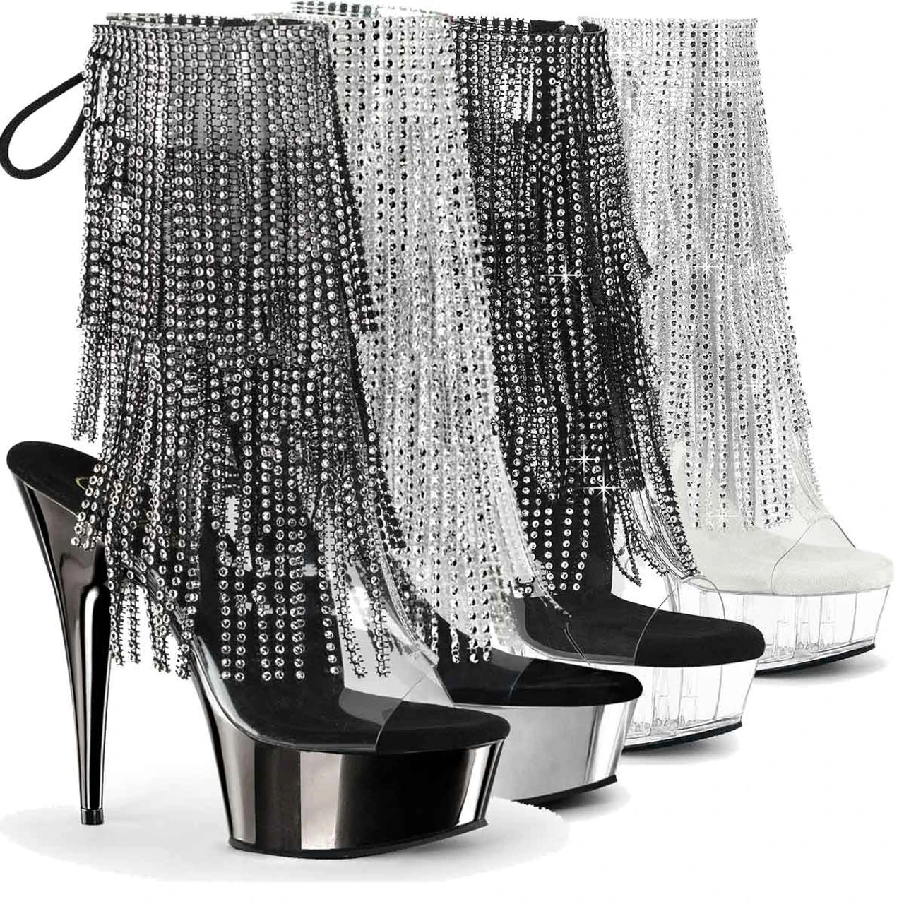 Pleaser Delight-1017RSF Approximately 6 Inch (15.25cm) Heel, 1 3/4 Inch (4.5cm) Chrome Plated Platform Open Toe/Heel Back Lace-Up Ankle Boots Featuring 4-Layer Chrome Plated, Simulated Rhinestone Fringe, Inside Zip Closure