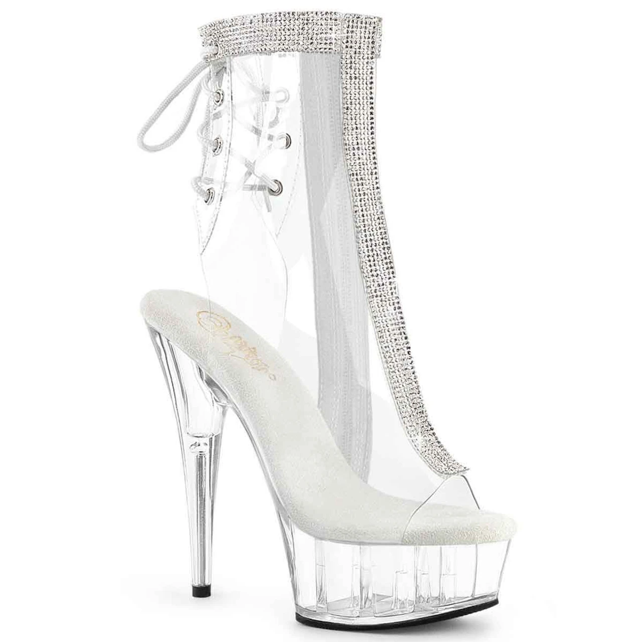 6″ (152mm) Heel, 1 3/4″ (45mm) Platform Open Toe/Heel Lace-Up Back Ankle Boot Featuring Rhinestone Embellishment Along Center Front & Topline, Inner Side Zip Closure