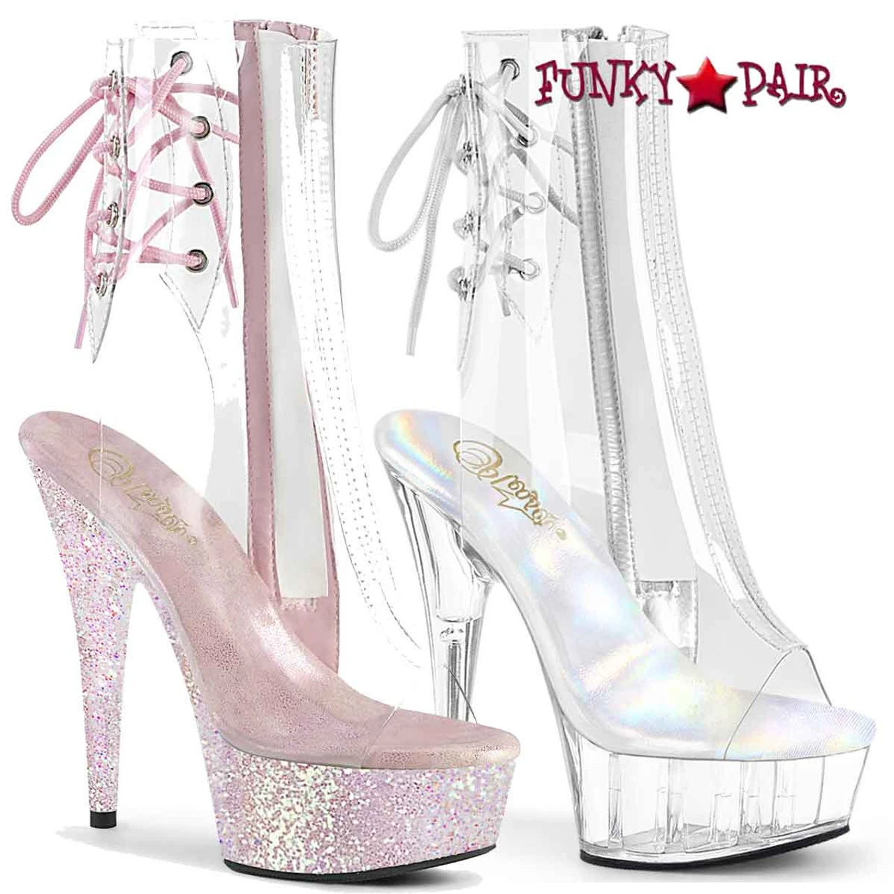 Open Toe/Heel Lace-Up Back Ankle Boot Featuring Holographic Glitters on the Entire Platform Bottom, Full Inside Zip Closure, approximately 6″ (152mm) Heel, 1 3/4″ (45mm) platform